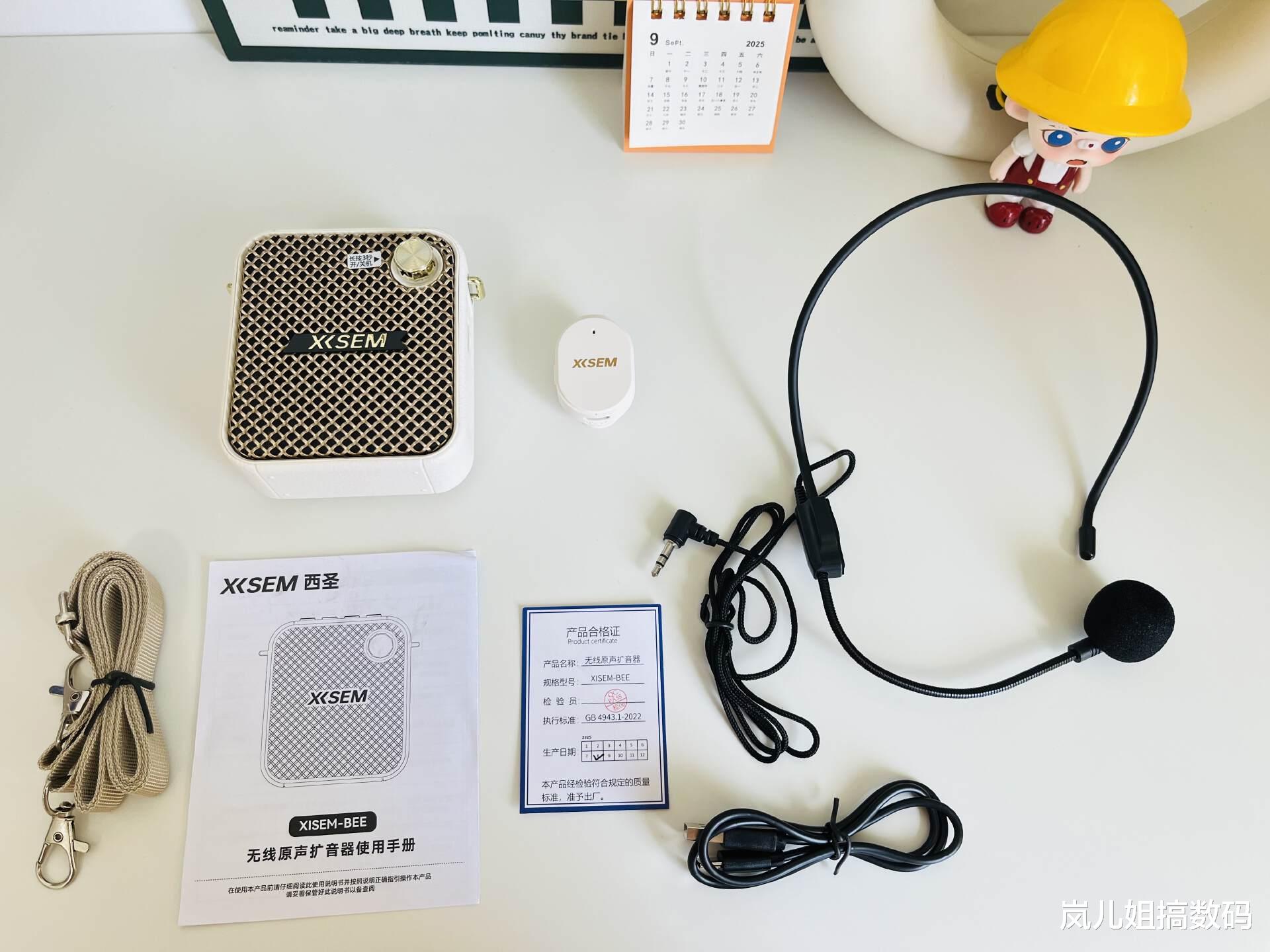 包装盒里包含了西圣Bee小蜜蜂扩音器、领夹麦克风、有线麦克风、挂绳、Type-C充电线、说明书以及合格证。