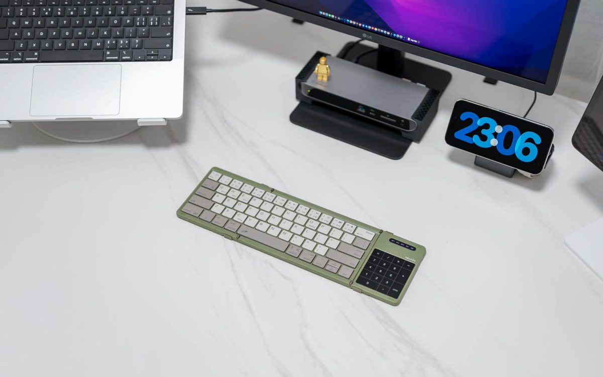 先说说最让我满意的便携性。它采用三折叠设计,折叠后尺寸仅182×108×16 mm,重量也才238 g,比一瓶小瓶装矿泉水还轻,随便塞进通勤包、甚至口袋里都不占空间,之前出差带传统键盘的“累赘感”彻底消失了。