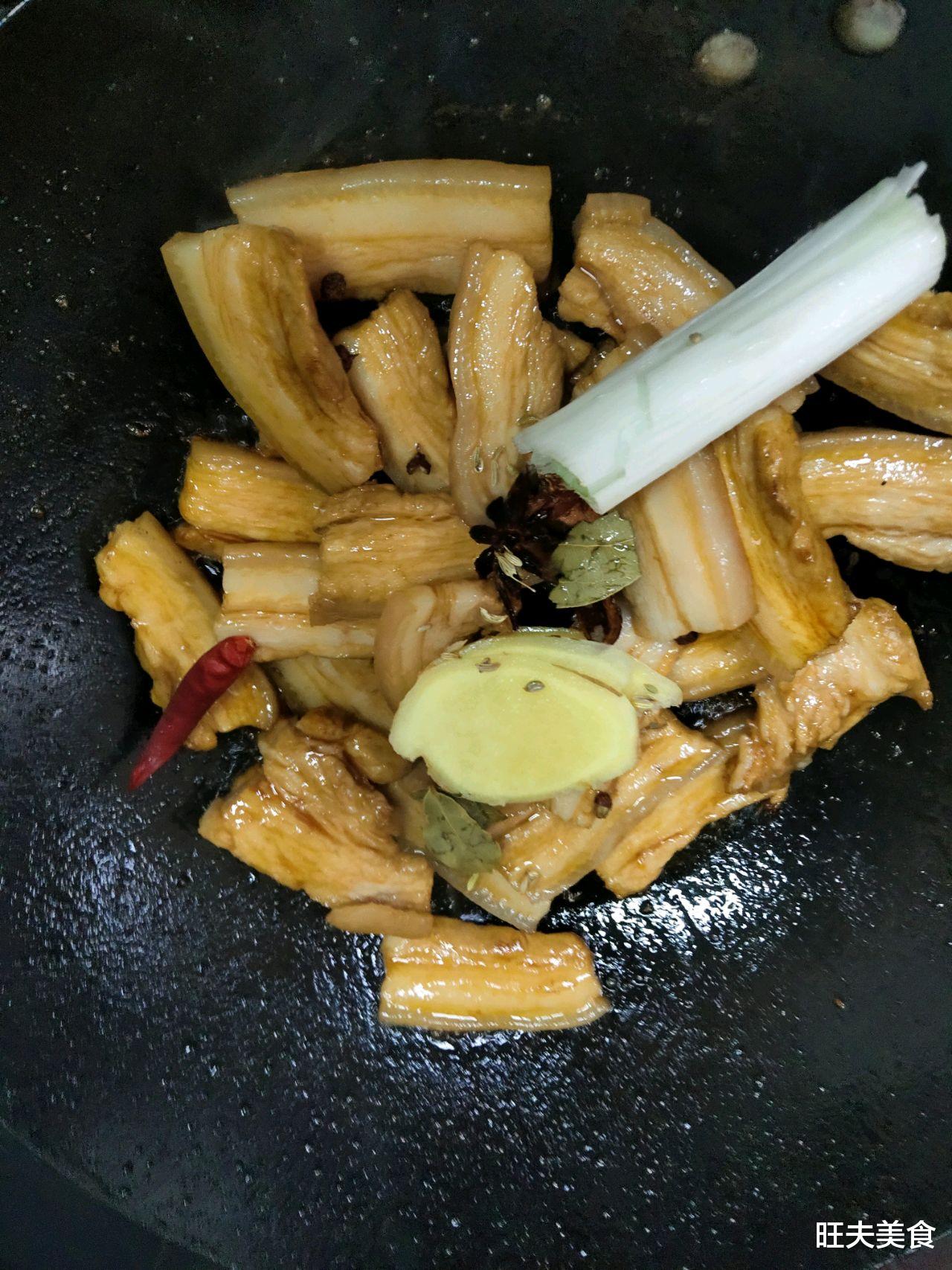 3. 在锅中炒糖色后,加入切好的五花肉,翻炒均匀。