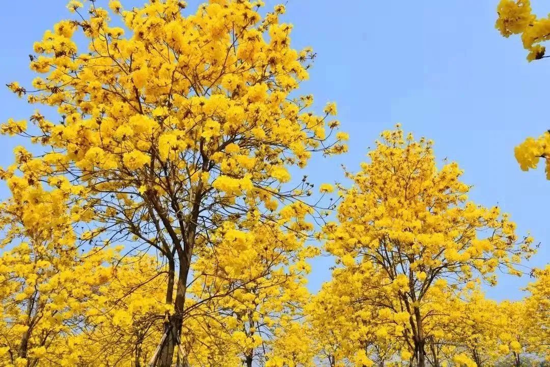 春暖花开时节,暖阳高照,黄花风铃木怒放,满城尽披“黄金甲”,树上挂满金条,地上金黄一片,浪漫至极!