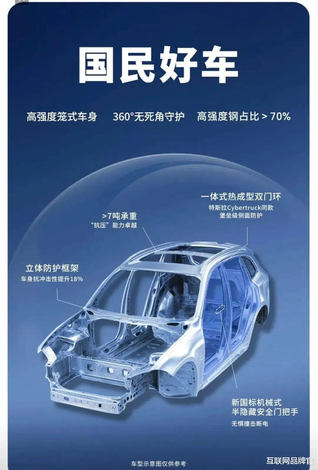 高强度笼式设计里,高强度钢占比超过七成,正面防护框架让抗冲击性提升了18%;侧面用的一体式热成型双门环,和特斯拉Cybertruck是同源技术,再配上新国标的隐藏式安全门把手,光看数据就觉得扎实。