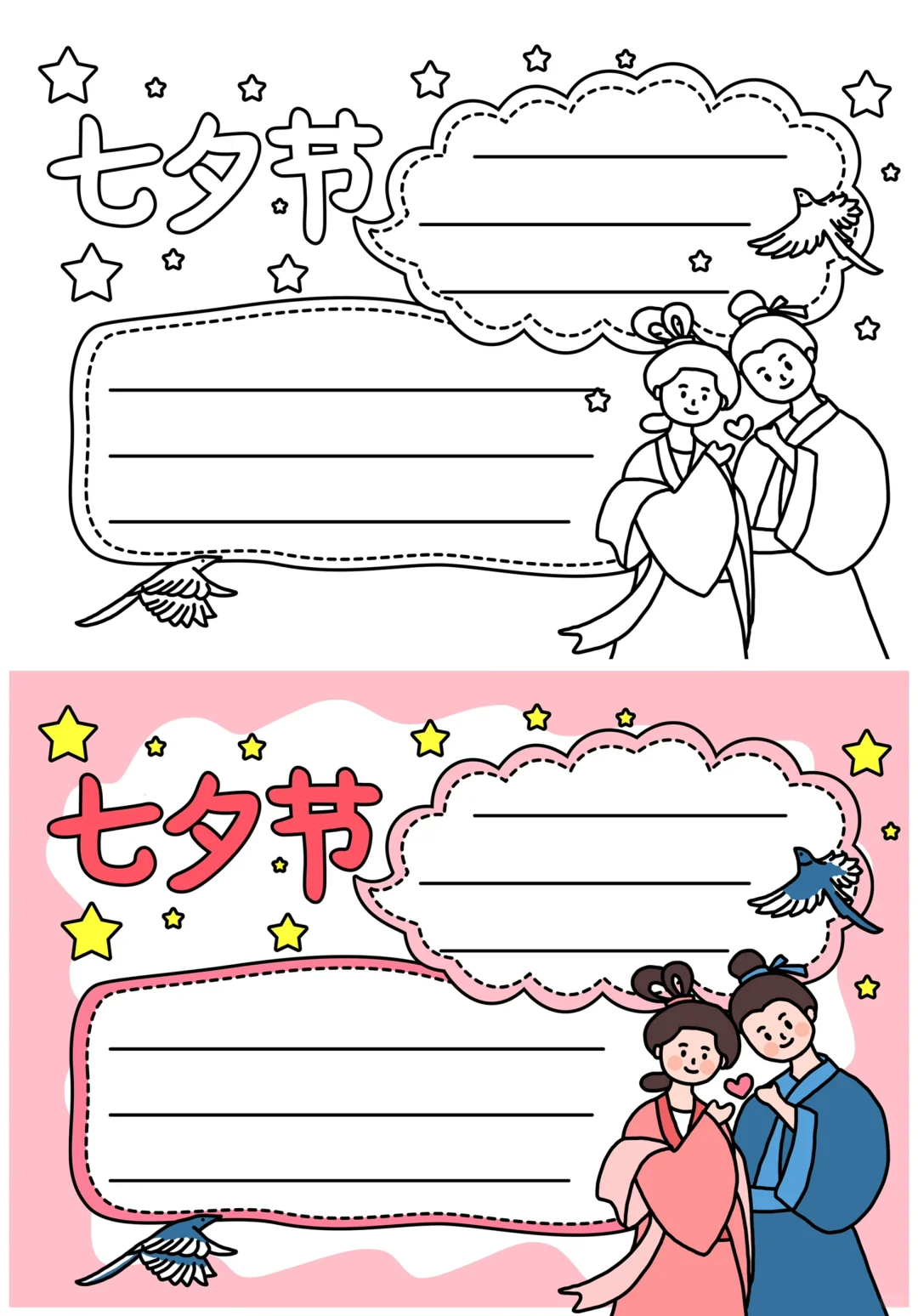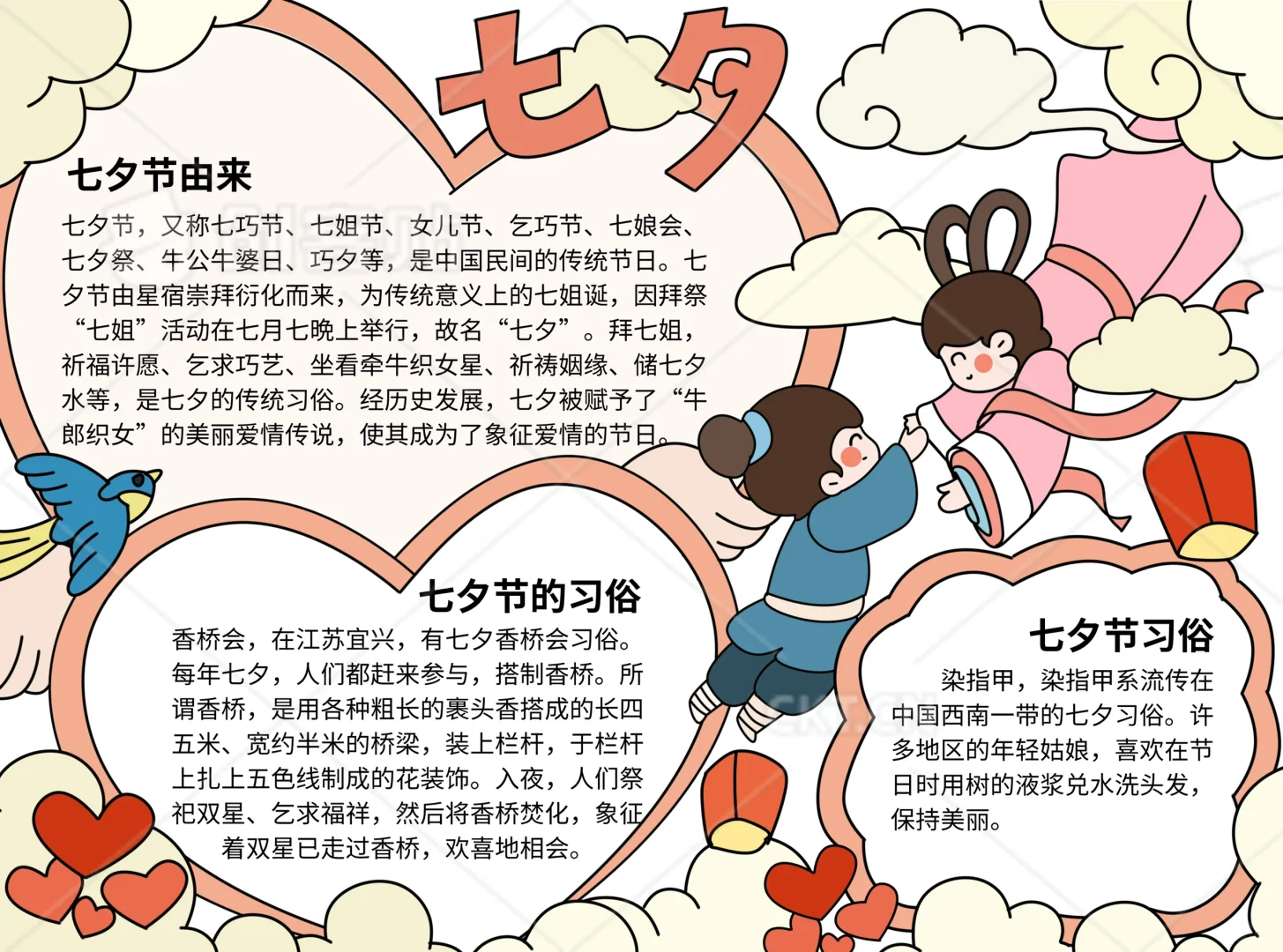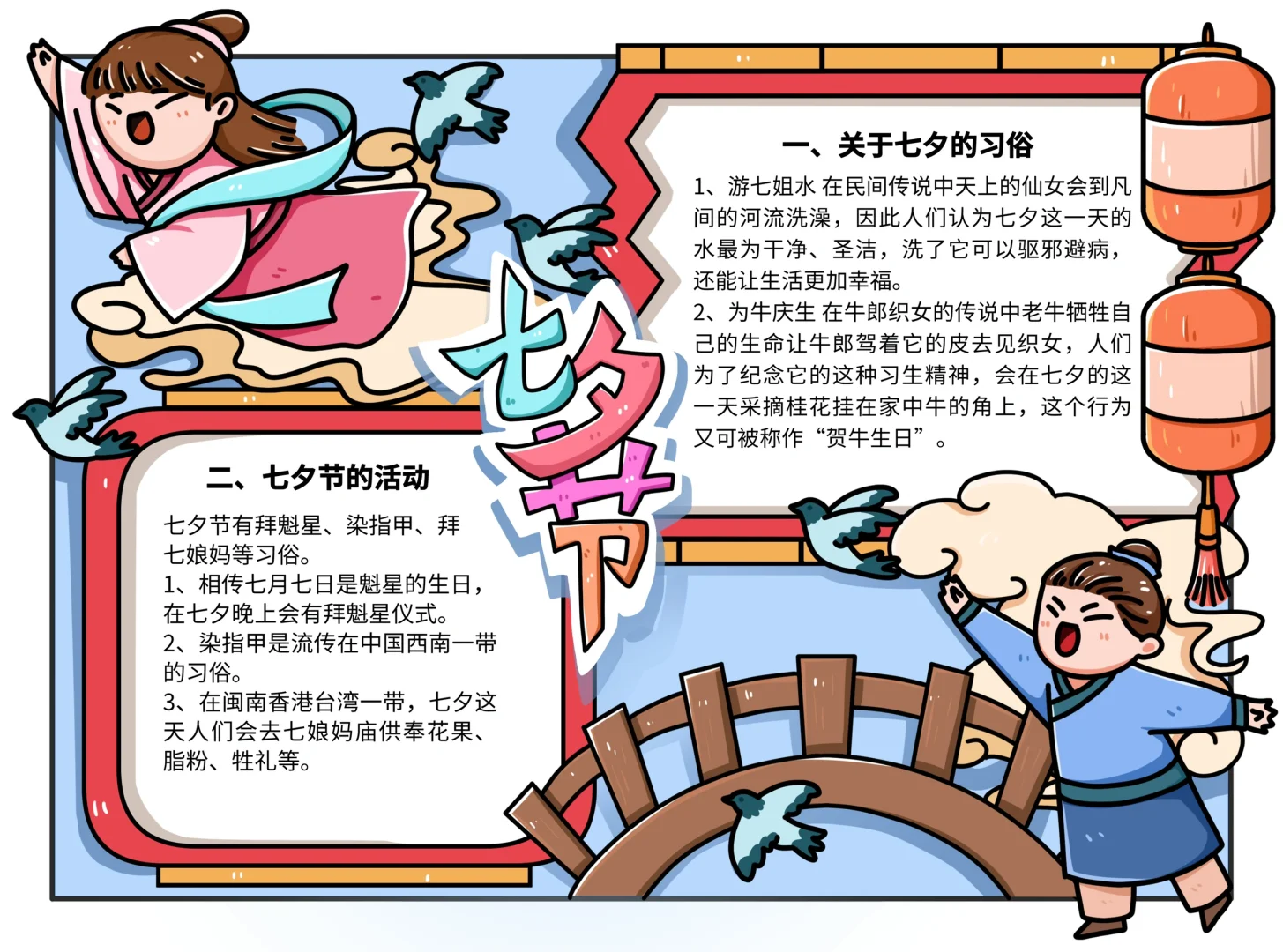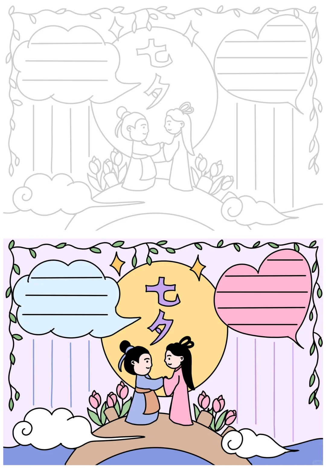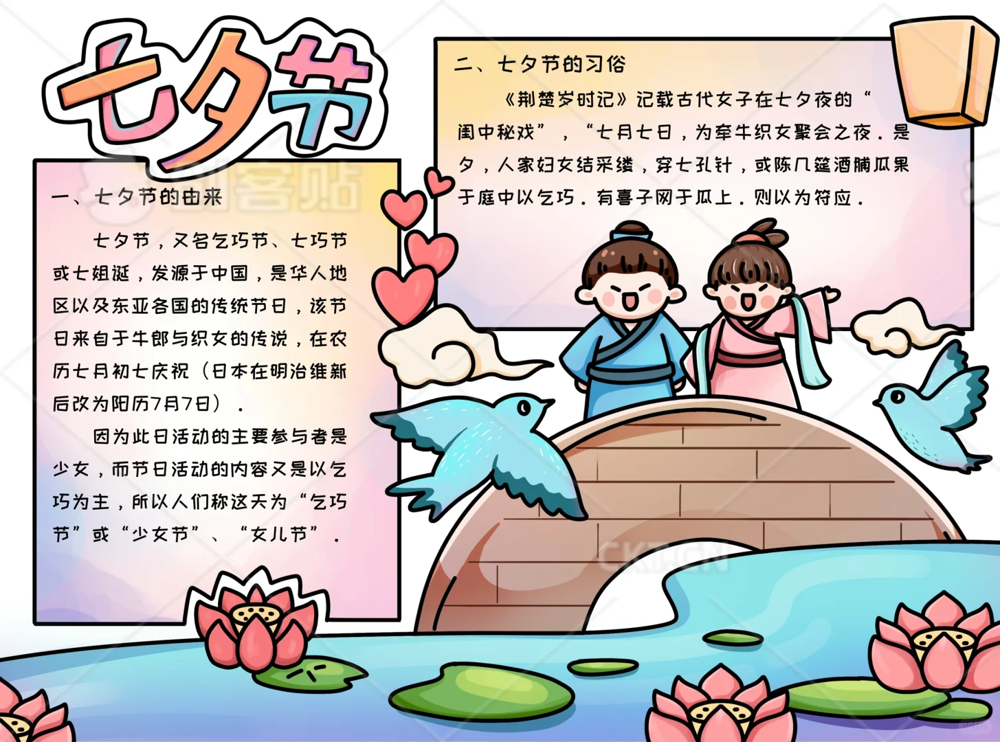 📚“七夕节”系列主题手抄报模版, 🎨标题、元素、图片、文案素材适用于主题画、手抄报、黑板报、手账,及相关的美术课程。 📚图片来源于