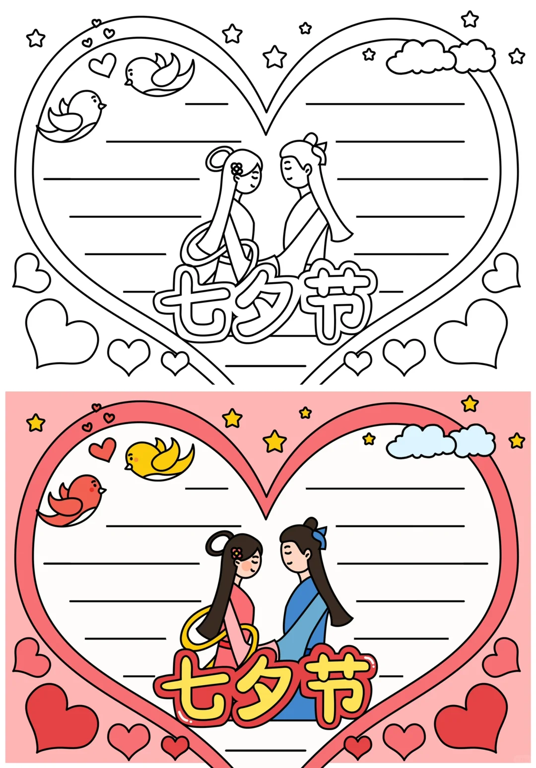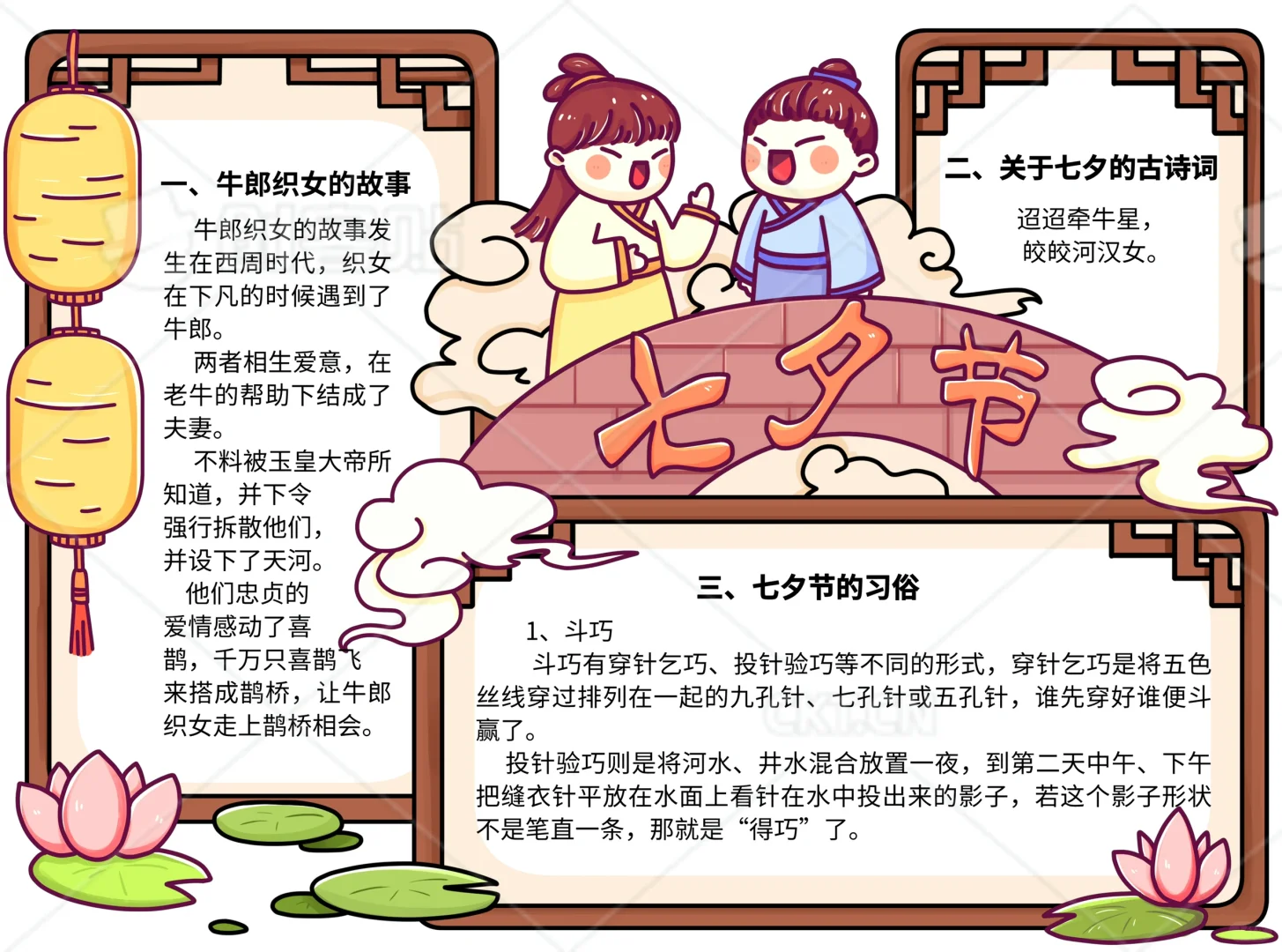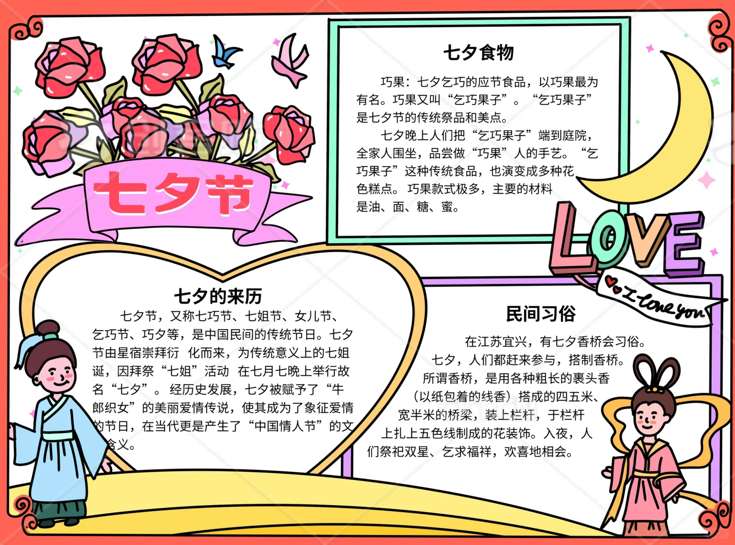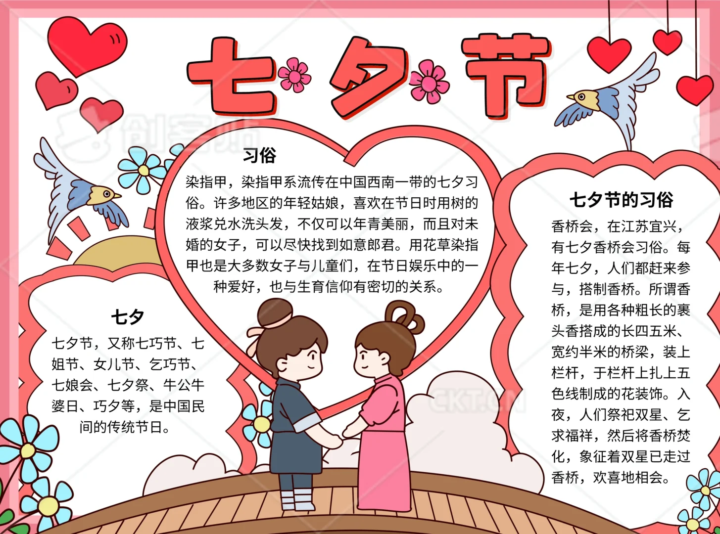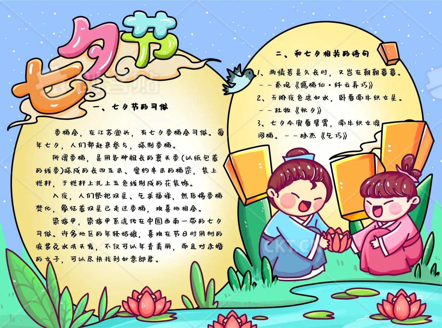 📚“七夕节”系列主题手抄报模版, 🎨标题、元素、图片、文案素材适用于主题画、手抄报、黑板报、手账,及相关的美术课程。 📚图片来源于