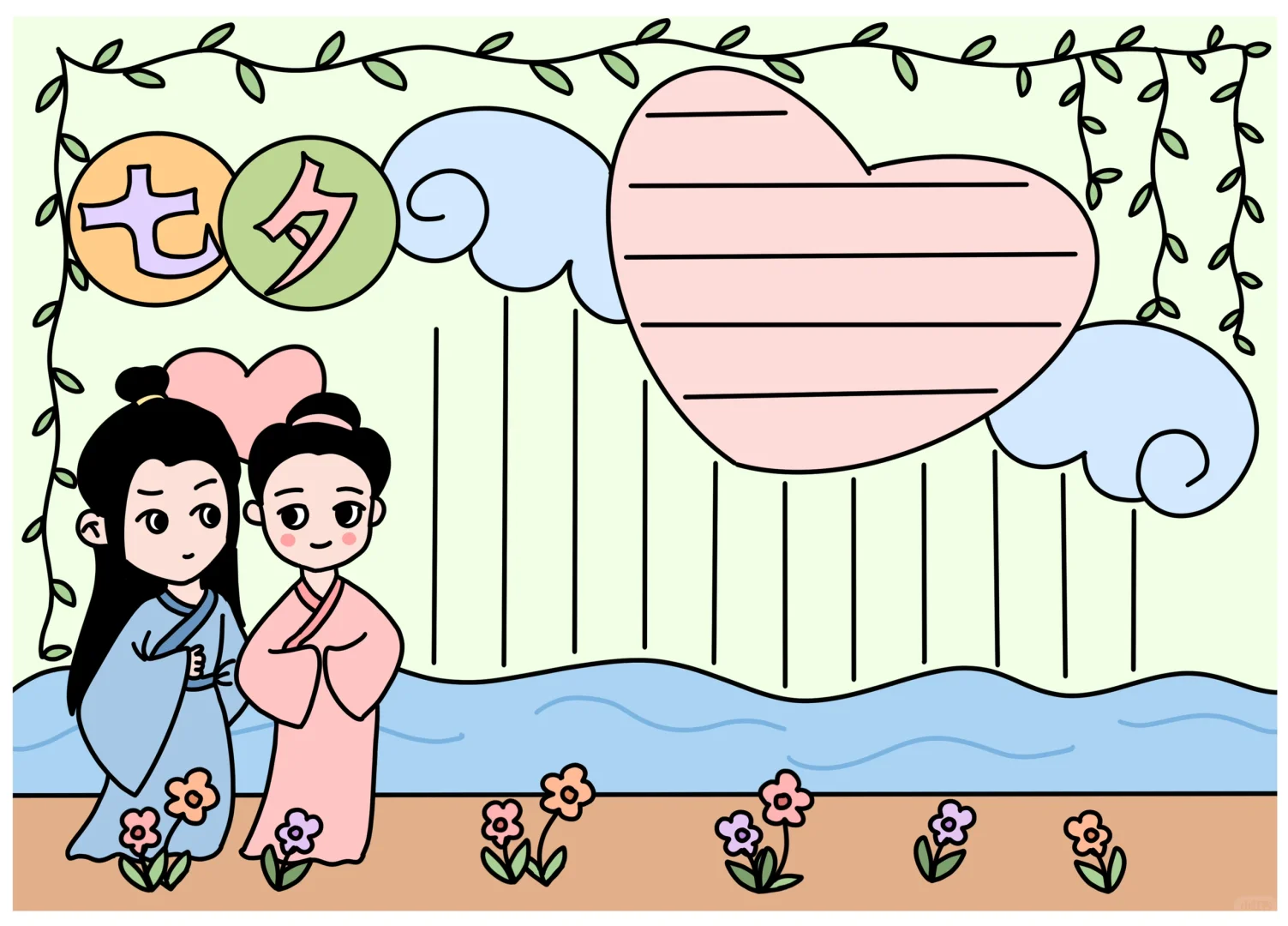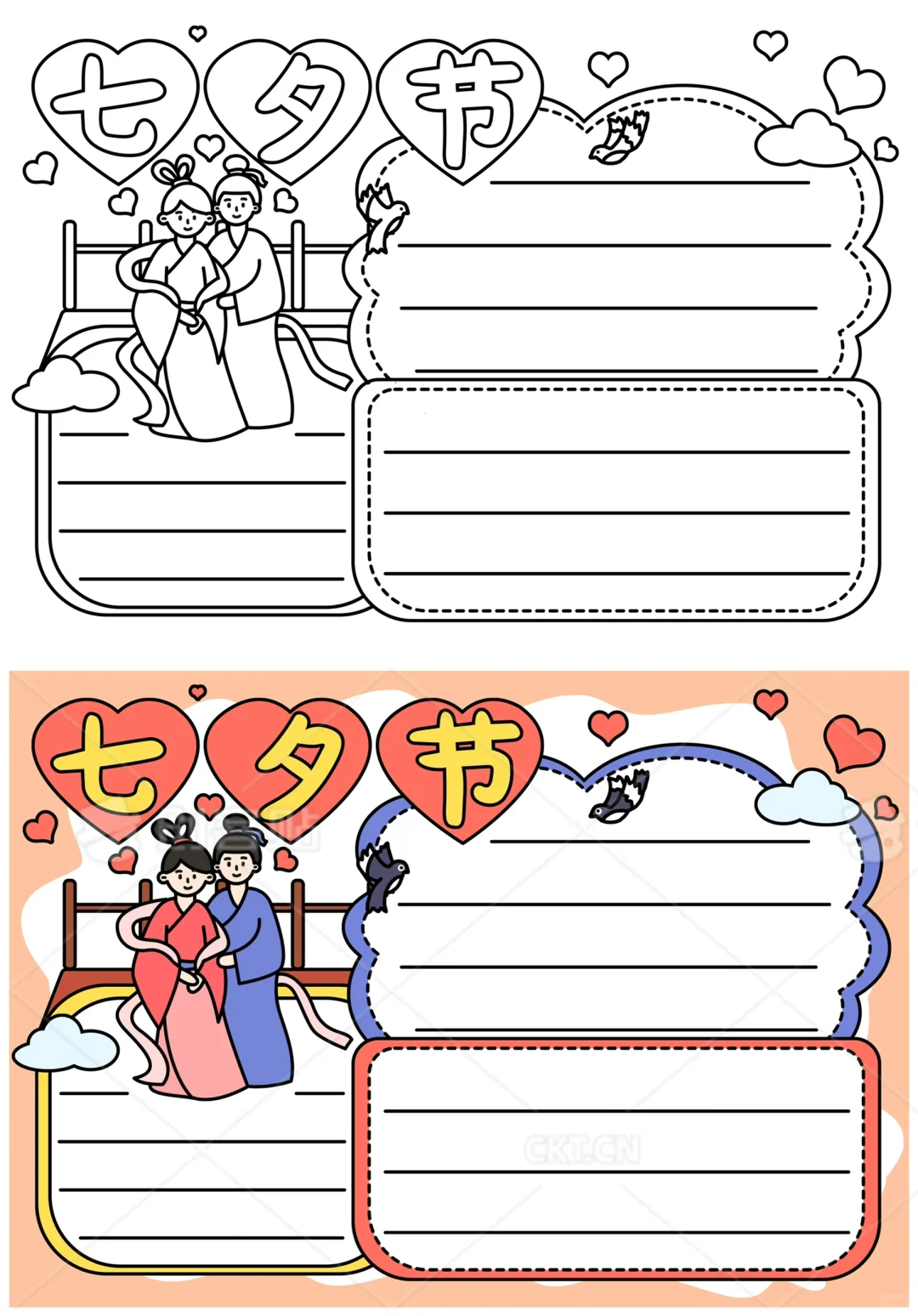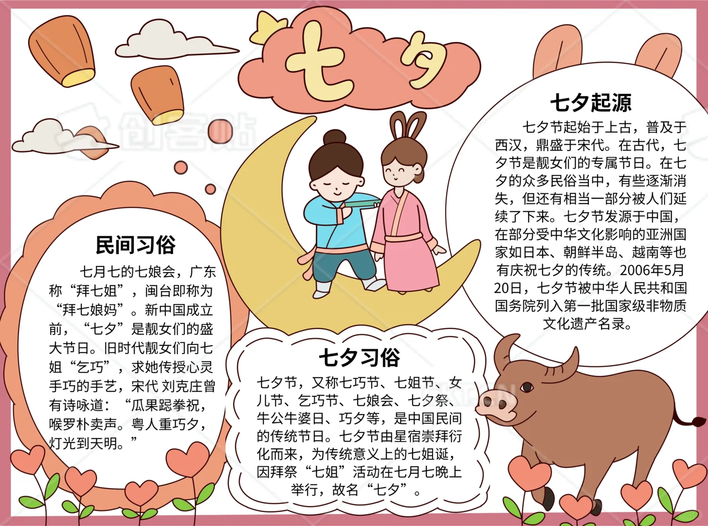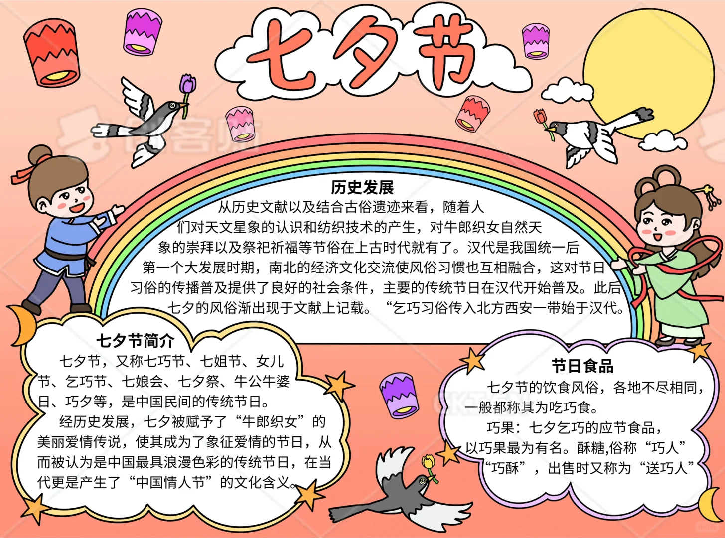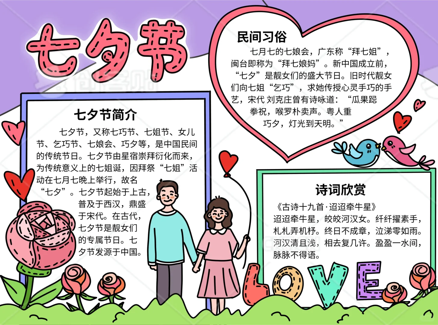 📚“七夕节”系列主题手抄报模版, 🎨标题、元素、图片、文案素材适用于主题画、手抄报、黑板报、手账,及相关的美术课程。 📚图片来源于