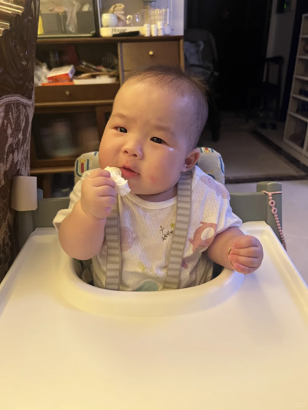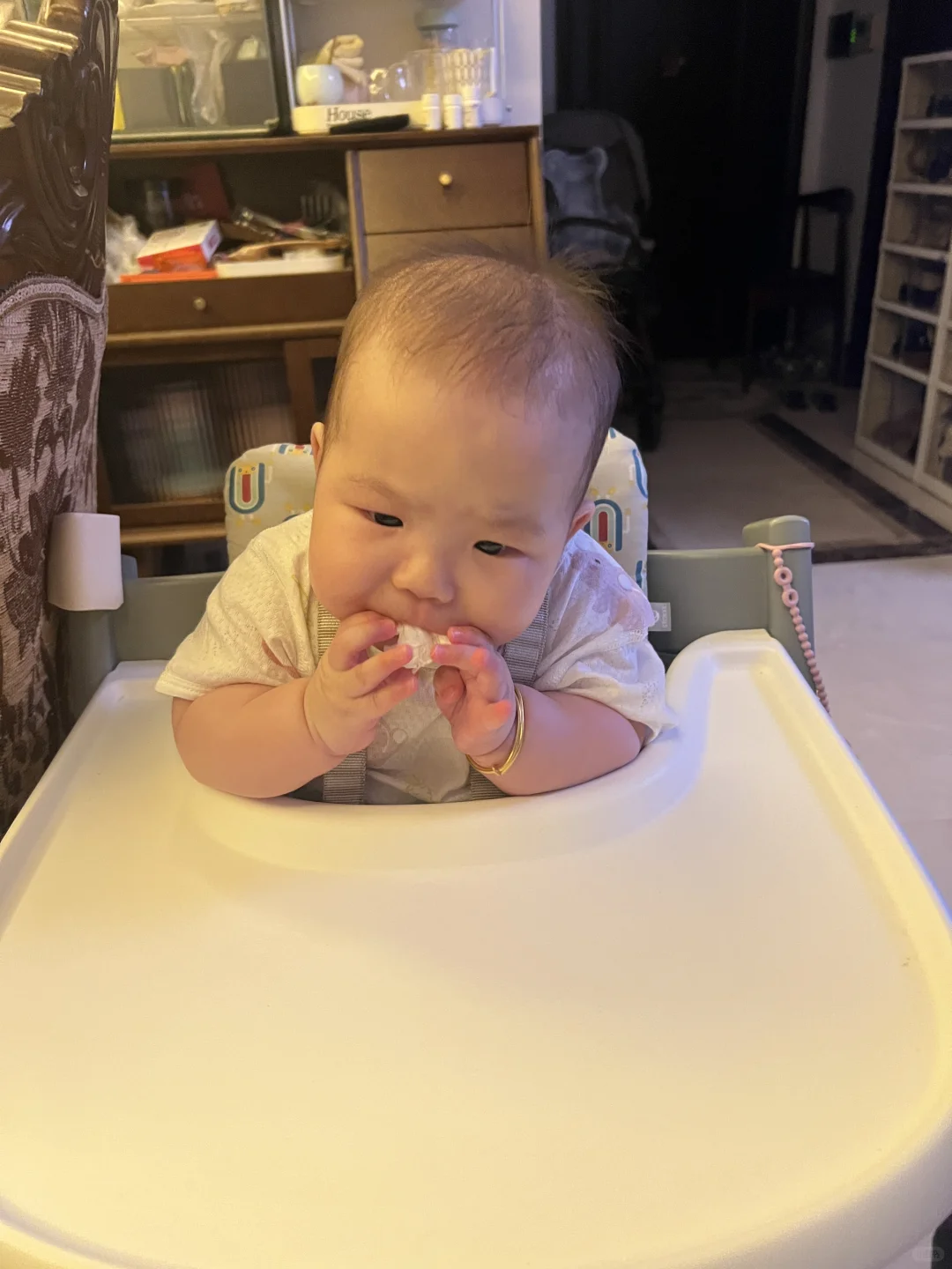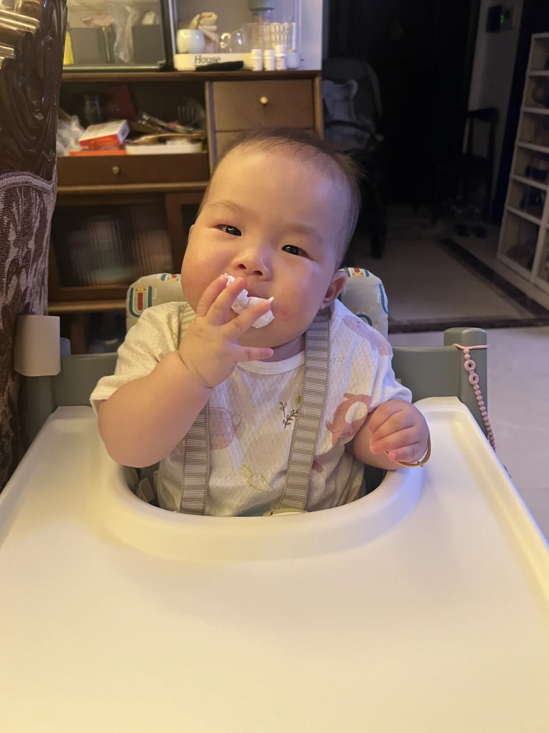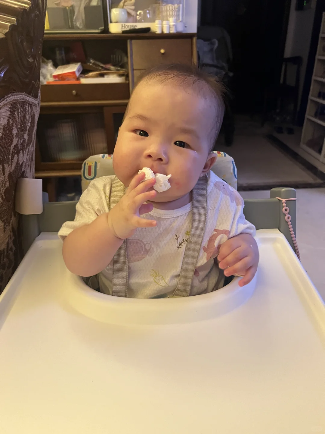六月龄吃货宝宝,吃嘛嘛香,出牙难受,磨牙饼干是小吃货的最优解?毕竟是个吃纸都很认真的娃~
