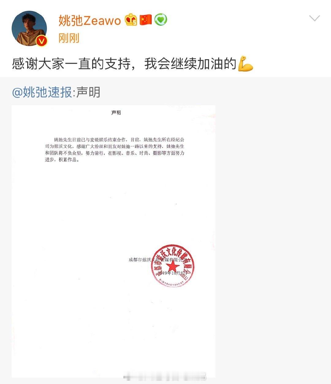 #姚弛解约#姚弛与麦锐解约姚弛方发声明宣布与麦锐娱乐结束合作,现在经纪公司为兹