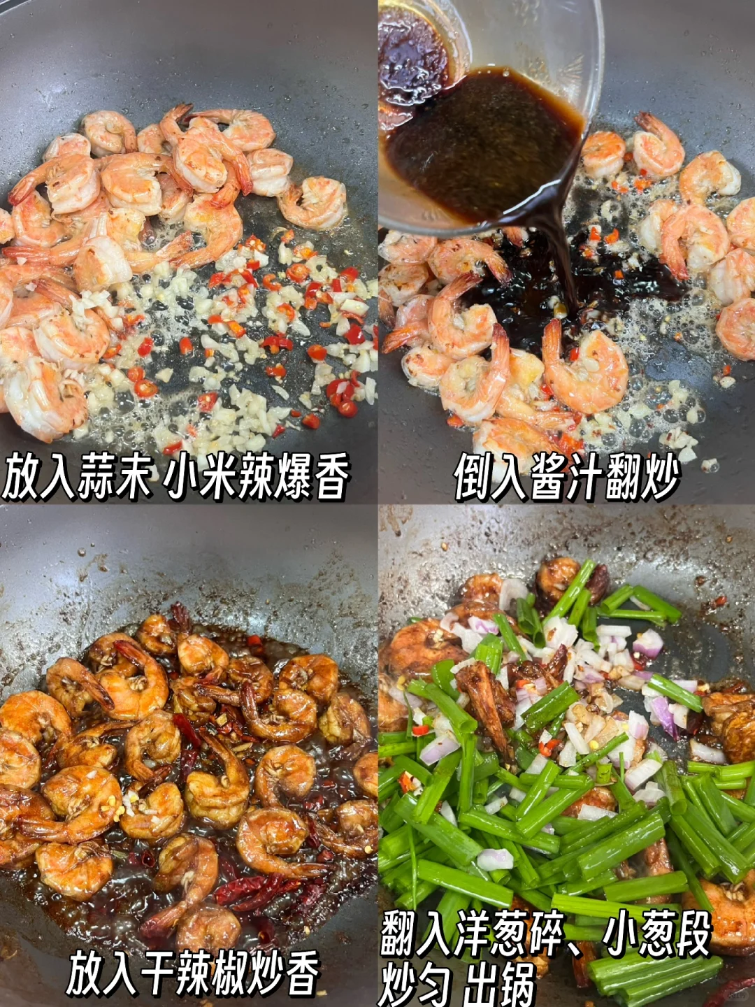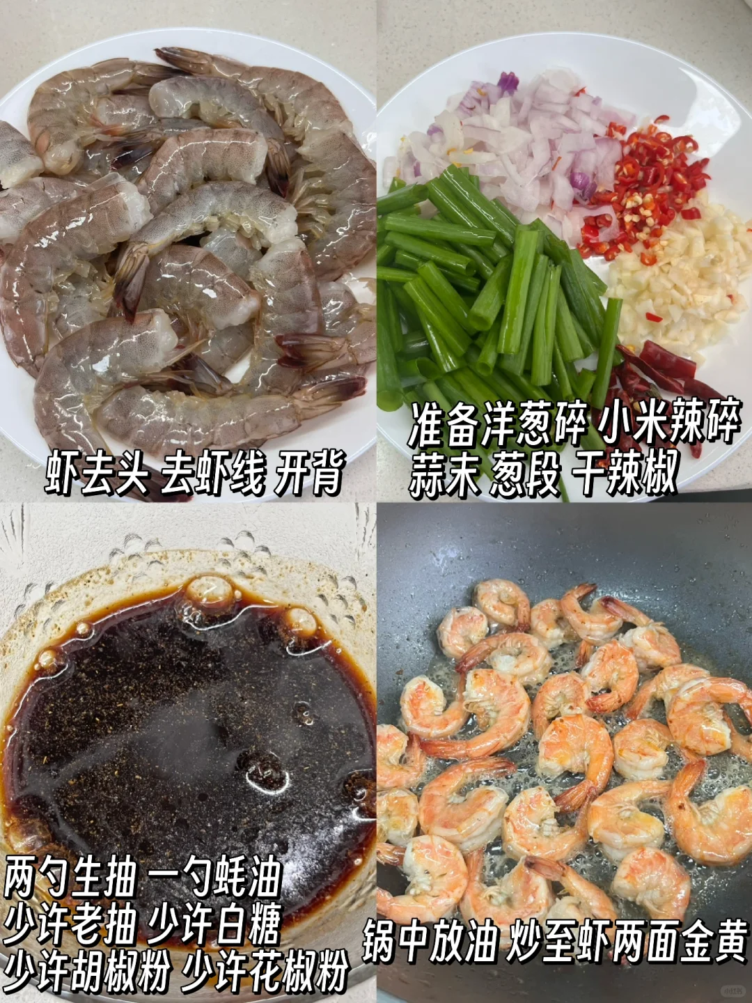 附做法: 1️⃣鲜虾去头、去虾线、开背,准备洋葱碎、小葱段、蒜末、小米辣碎、干辣椒 2️⃣提前调酱汁:两勺生抽、一勺蚝油、少许老抽、少许白糖、少许花椒粉、少许胡椒粉、小半碗水 3️⃣锅中稍多放些油,放入虾两面炒制金黄,放入蒜末、小米辣碎、一勺豆瓣酱炒香 4️⃣倒入料汁翻炒,倒入干辣椒翻炒,最后倒入洋葱碎、小葱段收汁出锅✅ -