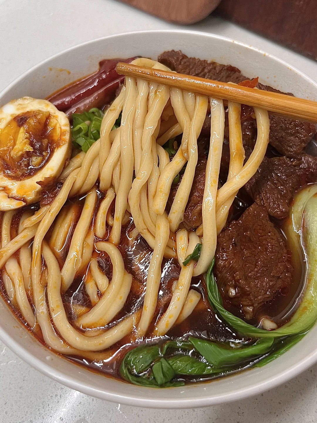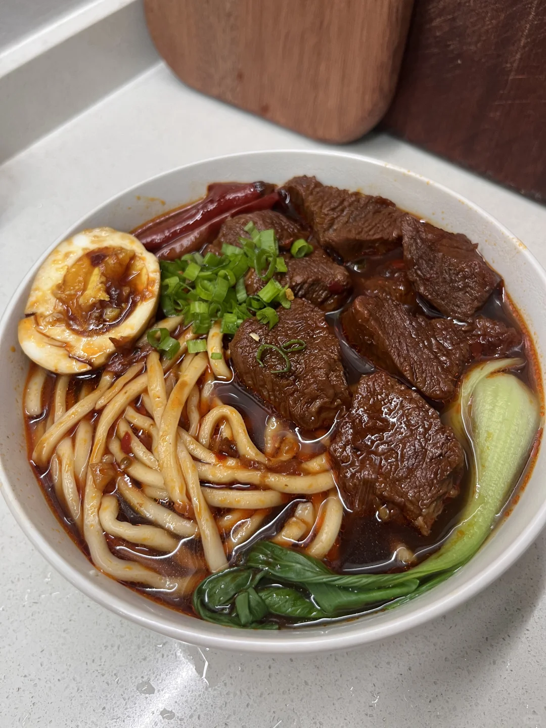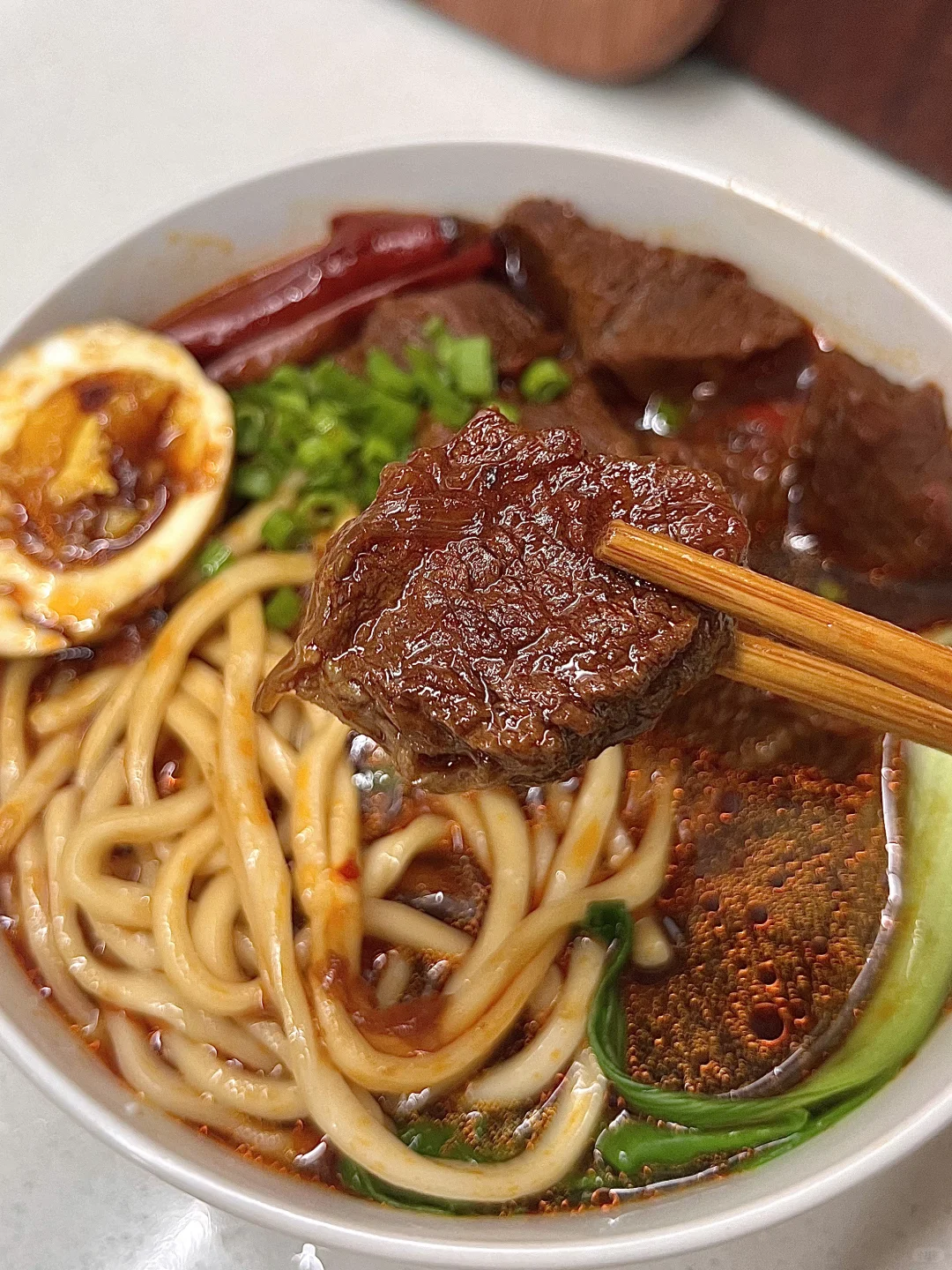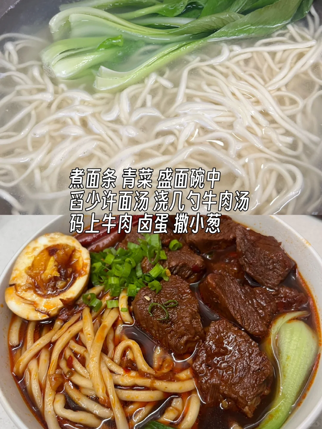 附做法: 1️⃣牛肉切大块,焯水捞出,洗净备用;锅中烧油,爆香洋葱、姜、蒜、葱 2️⃣放入牛肉炒干水分,放一勺料酒,放干辣椒、八角、香叶、桂皮 3️⃣放一勺豆瓣酱炒出红油,加一个番茄、几颗冰糖,两勺生抽、一勺老抽、适量盐 4️⃣加足量开水末过,小火炖煮一个半小时,煮面和青菜,放碗中,加几勺面汤,浇入牛肉汤,码上牛肉、卤蛋、葱花✅ -