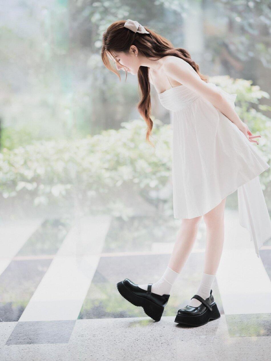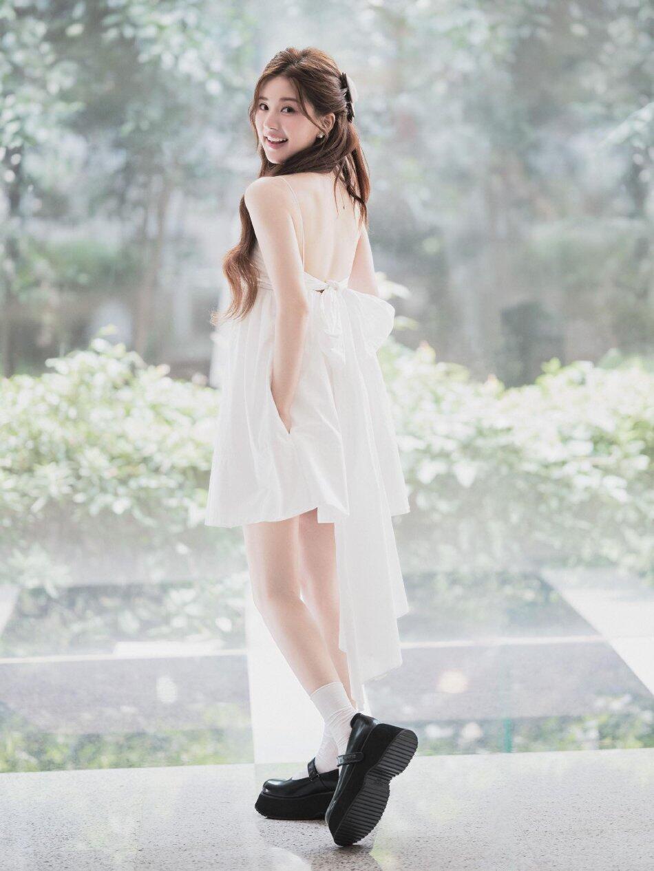 赵露思身穿白色吊带短裙,波浪卷发配蝴蝶结发饰,清新甜美。赵露思是一位有着清新气质和甜美笑容的女演员