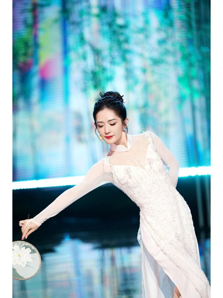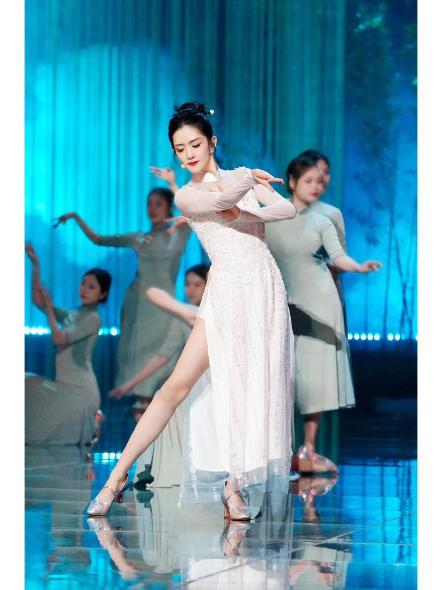 她在舞台上做出了高难度的一字马和劈叉动作,展现了她的柔韧性和力量。她的舞姿是柔美而灵动的,与她的眼神相辉映。她的旗袍是白色的,简洁而高贵,与她的肤色相映成趣。她的声音是坚定而有力的,与她的心灵相通。