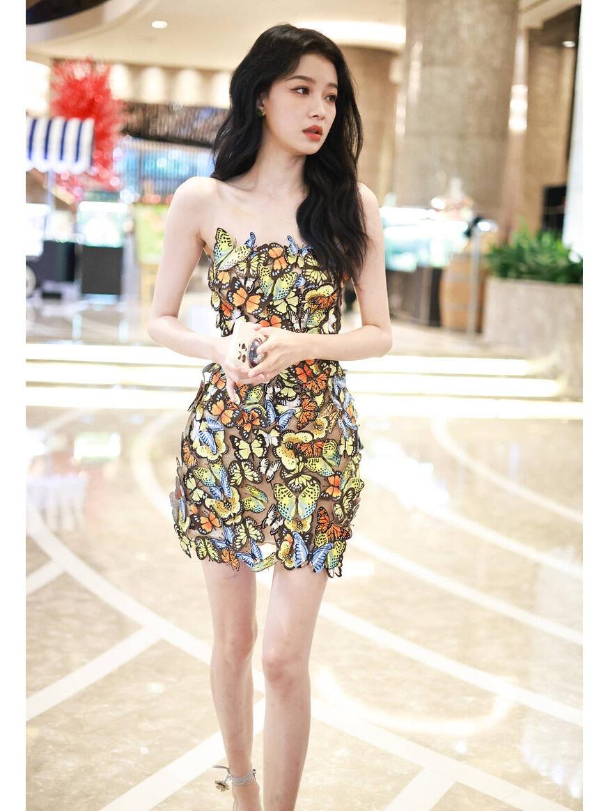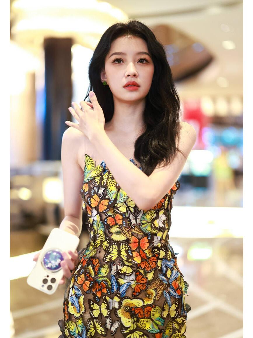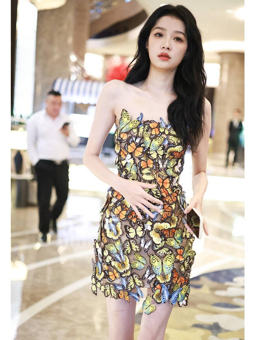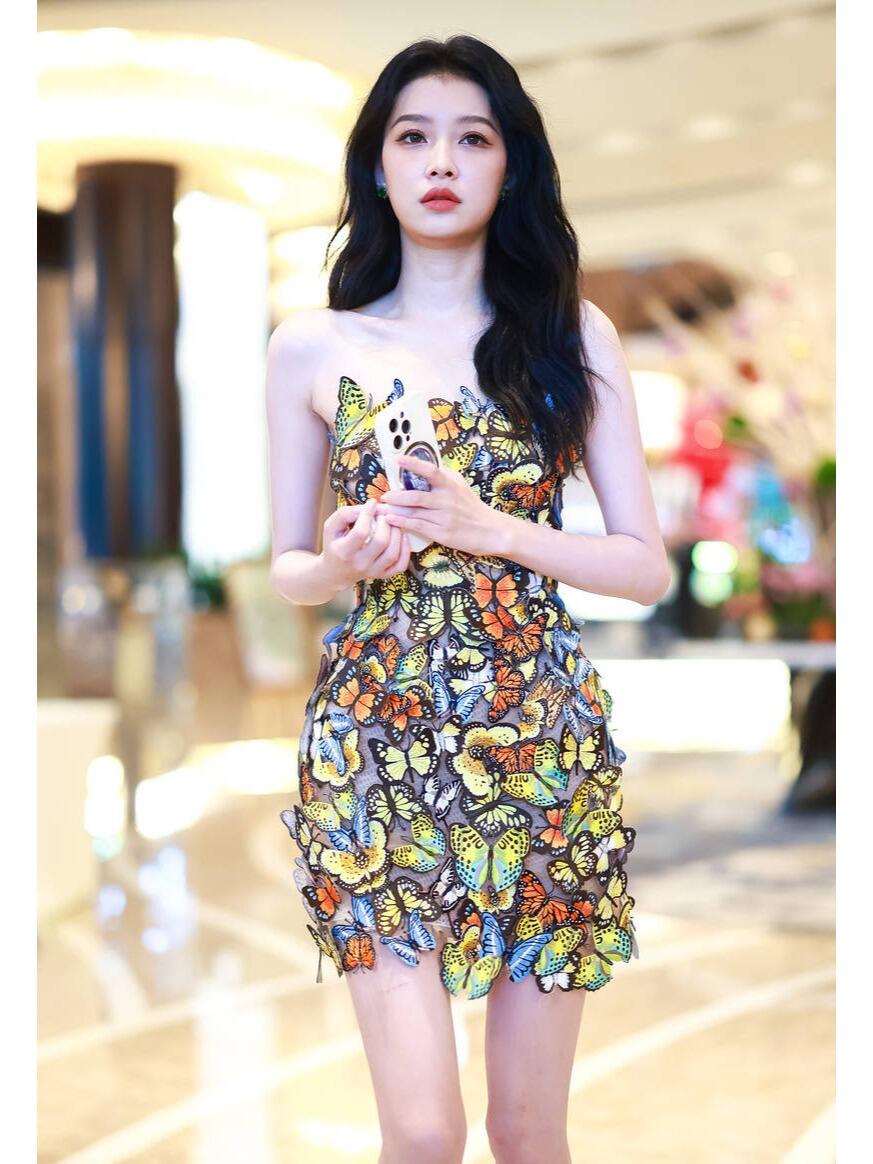 孙怡身穿一件蝴蝶图案的抹胸裙,露出纤细的长腿,轻抚着秀发,美艳动人。孙怡的气质清新出众,让人眼前一亮。