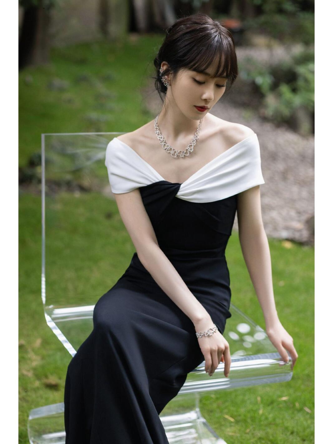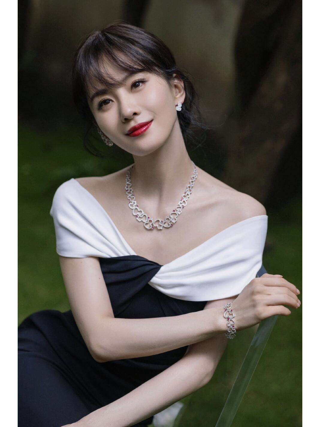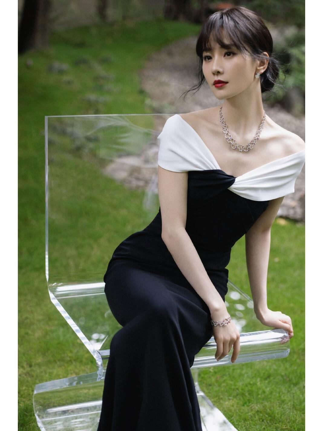刘诗诗身穿黑白渐变色的一字肩长裙,展现完美的锁骨和肩颈线,气质出众。