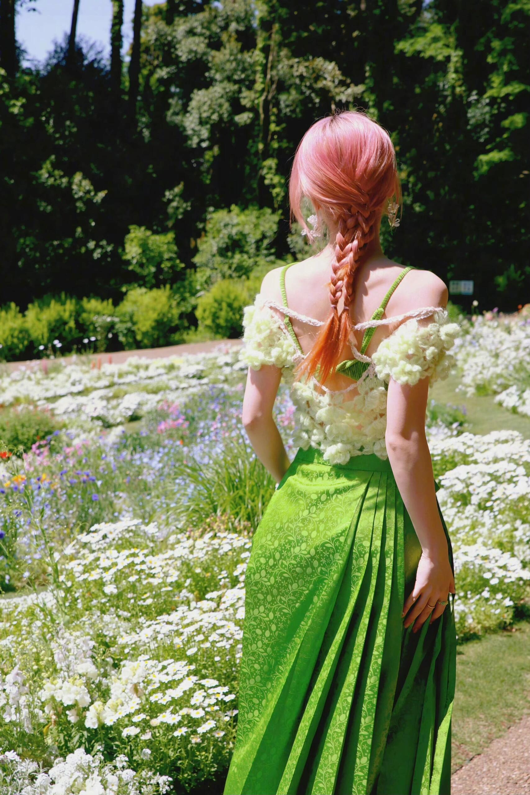 草地这一组照片我真的第一眼看到就被美晕了,这景色、这配色、这穿搭……全都直击我的心巴巴而且这一套衣服还非常混搭,上半身是泳衣和钩花,下半身是马面裙,简直太有想法了,但很和谐很美!