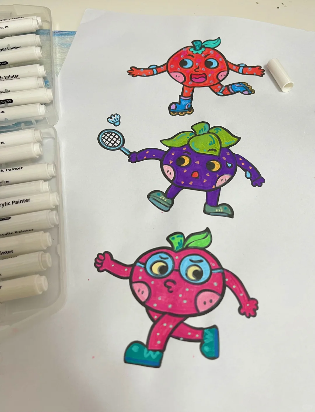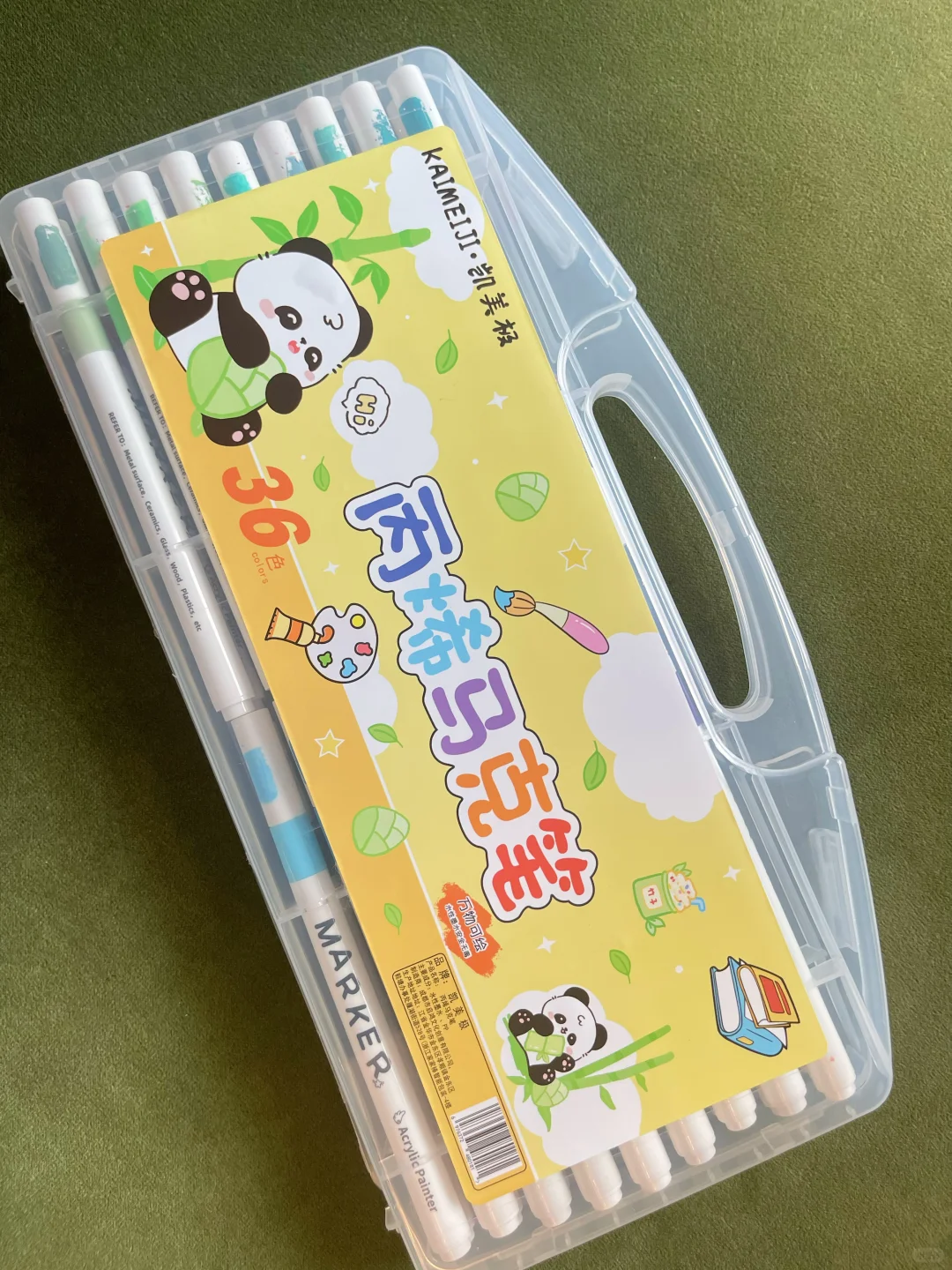 ⭐️⭐️⭐️优点: 1⃣️性价比高,便宜,我这盒36色才13.9; 2⃣️出水流畅,使用方便,无需甩笔压笔; 3⃣️水性墨水,不小心画在手上、桌上、衣服上可以擦洗掉,适合幼儿园及小学生使用; 4⃣️不会沁色、不会透纸、可以叠色; 5⃣️日常可替代水彩笔和普通马克笔来使用,减轻负担,不必买一套水彩笔打底又要再买一套丙烯笔来叠色。 ⭐️⭐️⭐️缺点: 1⃣️颜色饱和度不是特别高,色彩呈现度跟普通马克笔差不多,干的速度一般; 2⃣️因为可水洗的原因,所以覆盖力也一般,看图2👆。 💫💫💫总之,作为一款入门丙烯笔,还是非常能够满足日常绘画需求的,适合幼儿园及小学生使用,详情👇🛒。