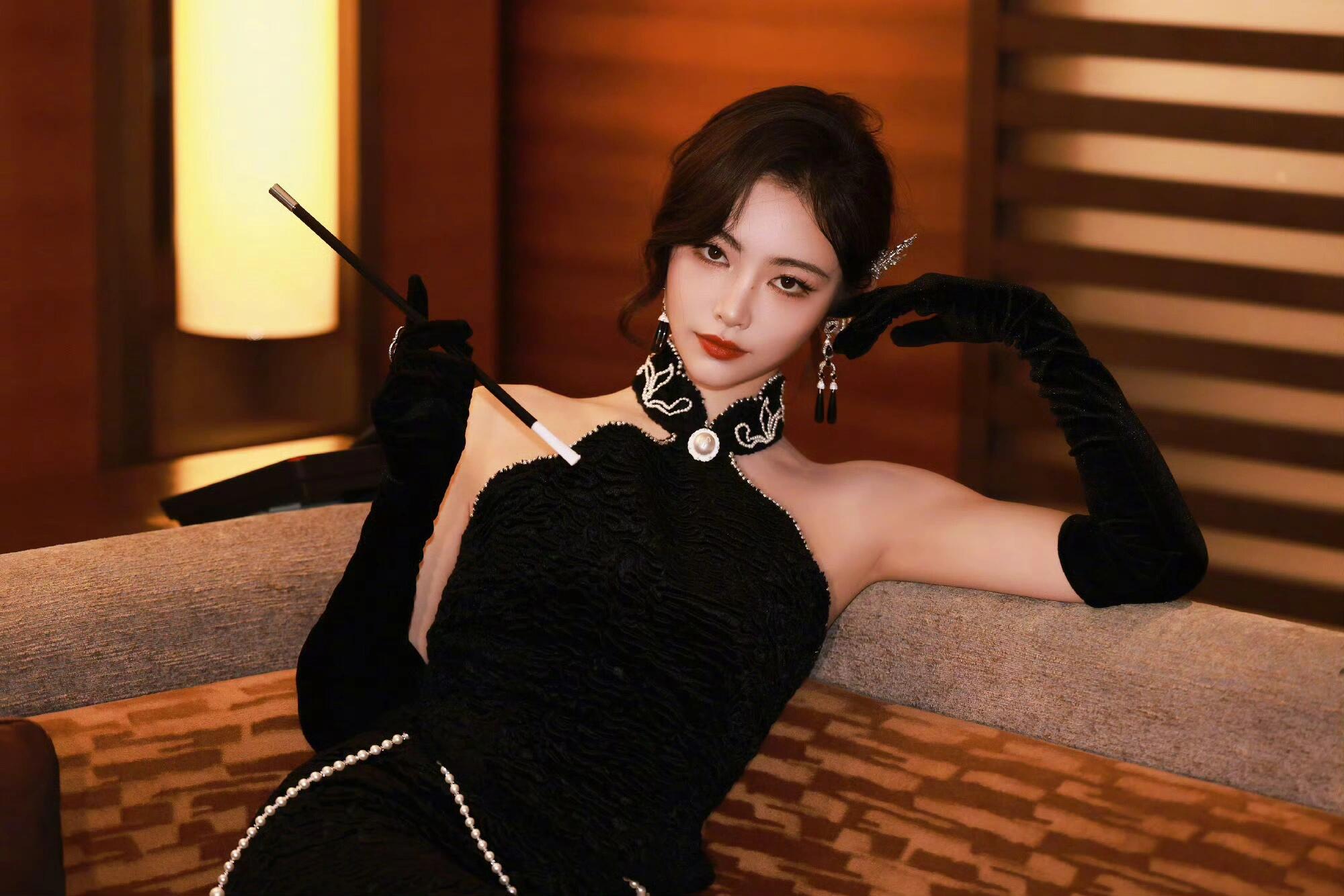 许佳琪kiki,一袭黑色礼服搭配红唇妆容,羽毛披肩、别致发饰… 复古风韵的KiKi