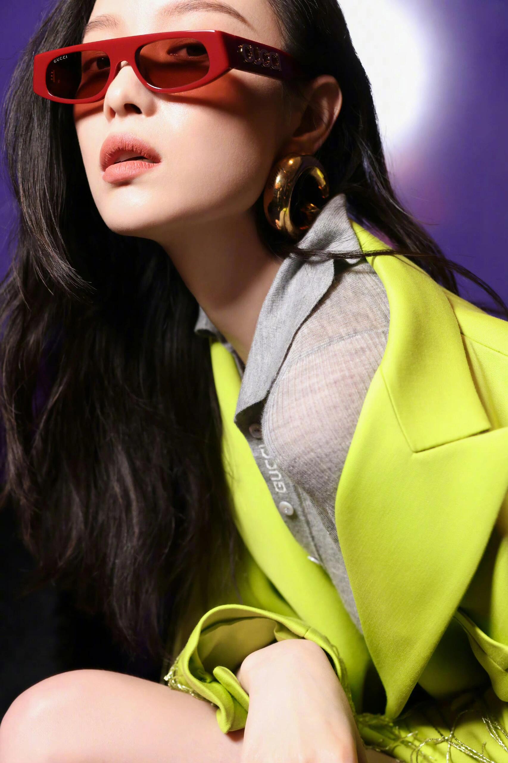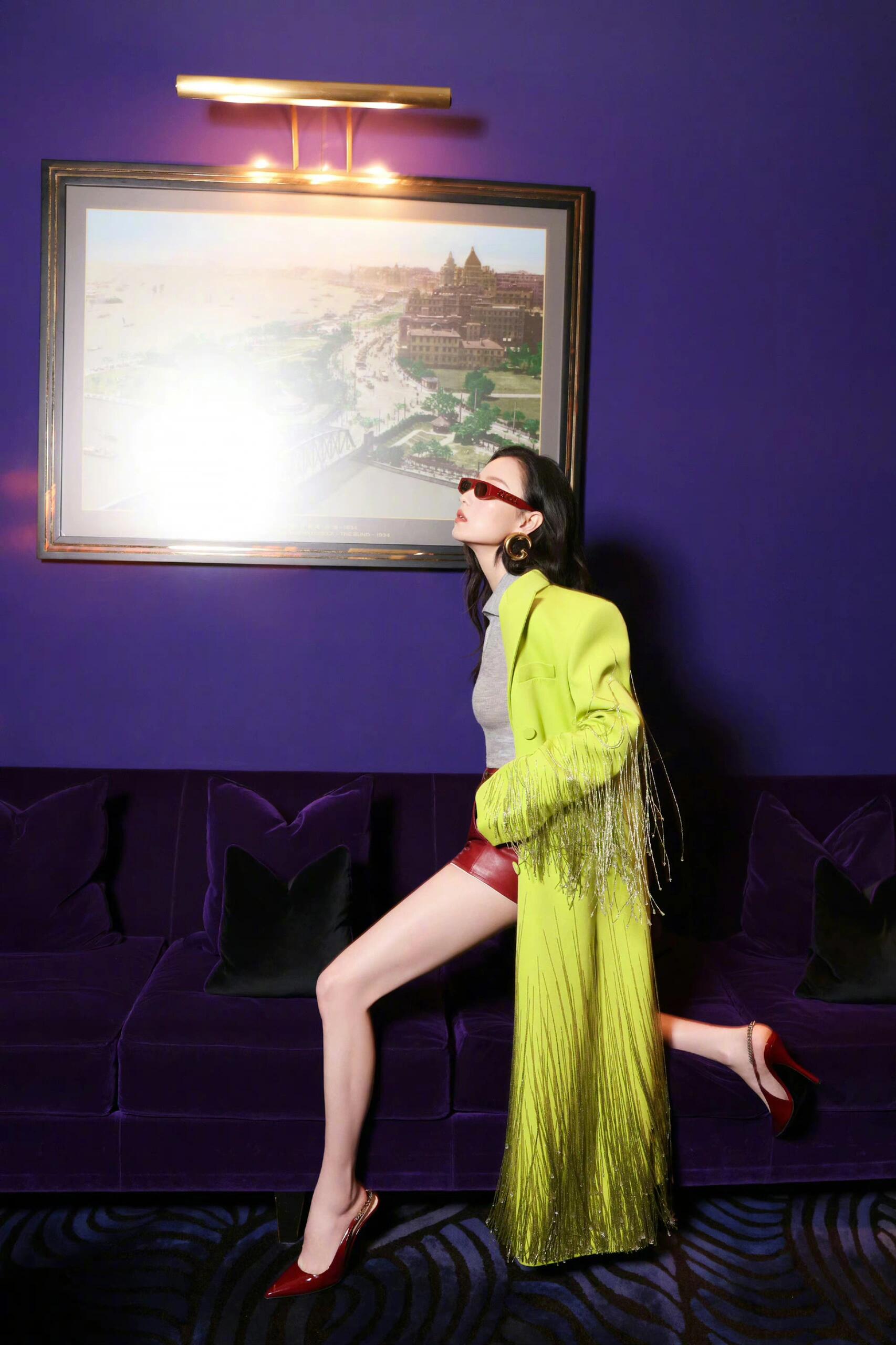 倪妮造型图集,荧光绿流苏大衣配安可拉红短裤和高跟鞋,随性干练的时髦女郎!