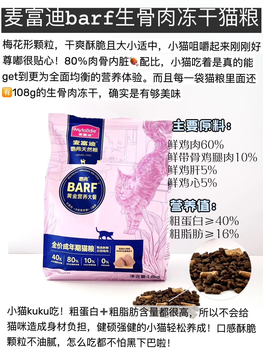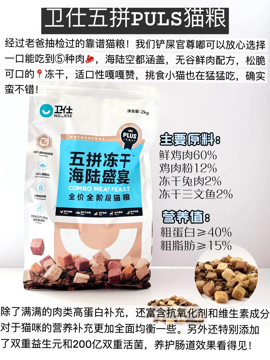经过老爸抽检过的靠谱猫粮!我们铲屎官尊嘟可以放心选择,一口能吃到⑤种山珍海味,无谷鲜肉配方,松脆可口的冻干,适口性嘎嘎赞,挑食小猫也在猛猛吃,确实蛮不错啦!