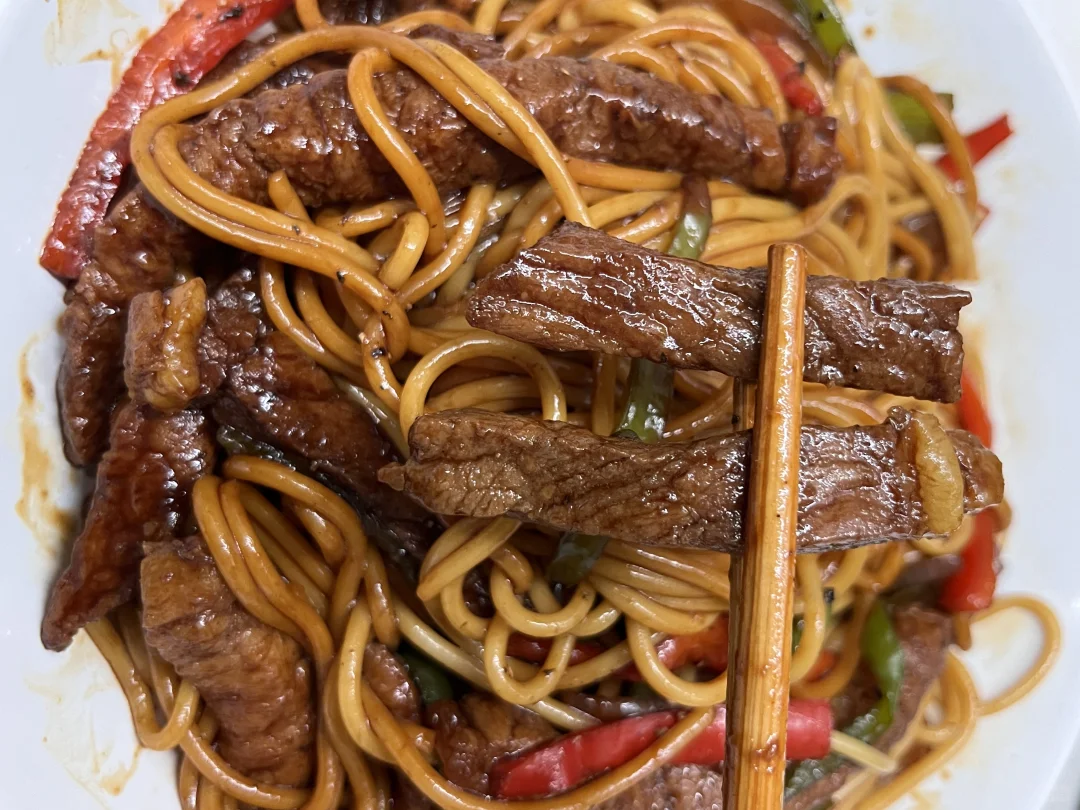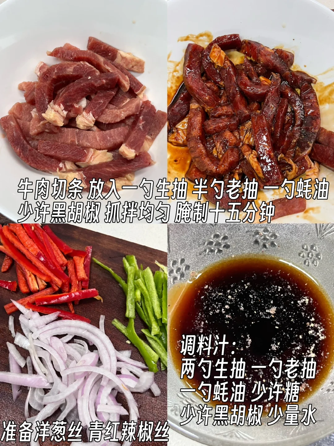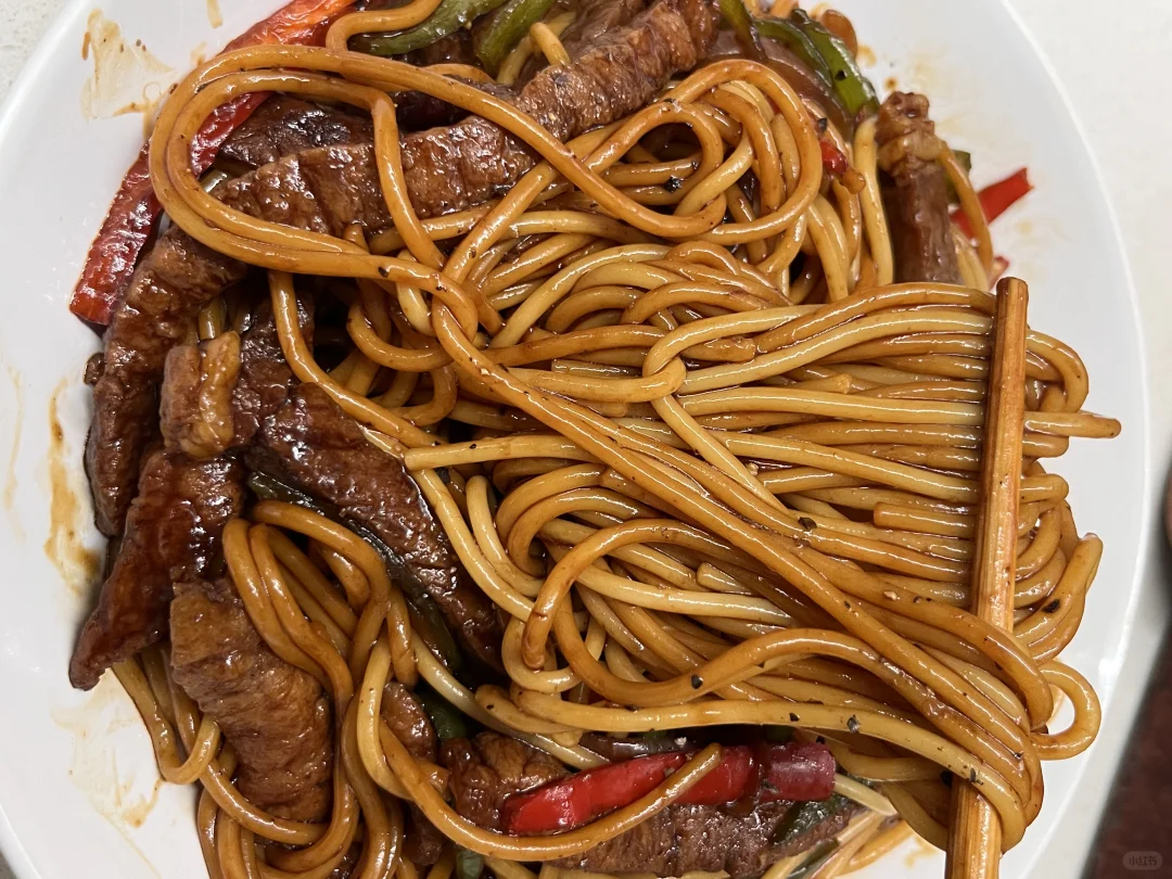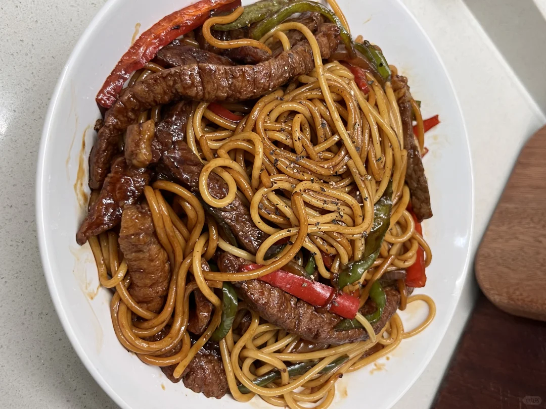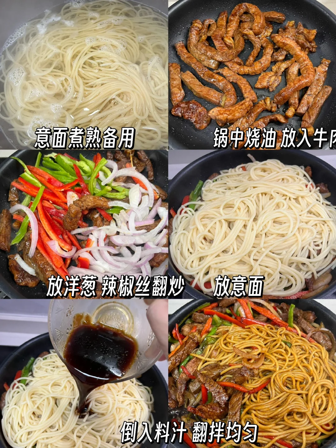 附做法: 1️⃣牛里脊切长条(或者直接用牛排),放入一勺生抽、半勺老抽、一勺蚝油、少许黑胡椒抓拌均匀,腌制十五分钟 2️⃣准备洋葱丝、青红辣椒丝,提前调好料汁:两勺生抽、一勺老抽、一勺蚝油、少许糖、少许黑胡椒、少量水搅拌均匀 3️⃣意面提前煮好备用,锅中烧油,放入牛肉炒熟,放入辣椒丝、洋葱丝翻炒,放入煮好的意面 4️⃣倒入料汁翻拌均匀,出锅✅ -