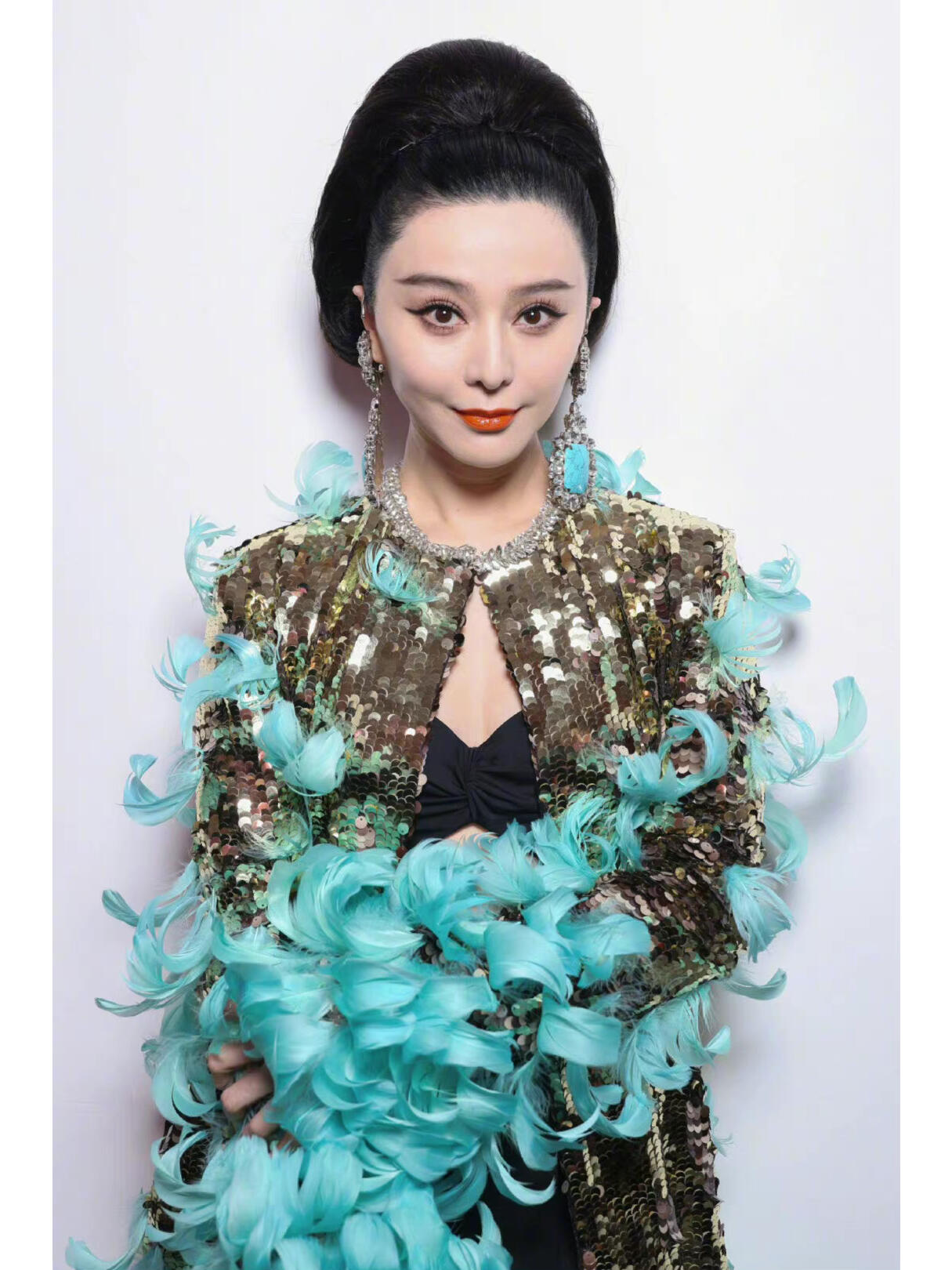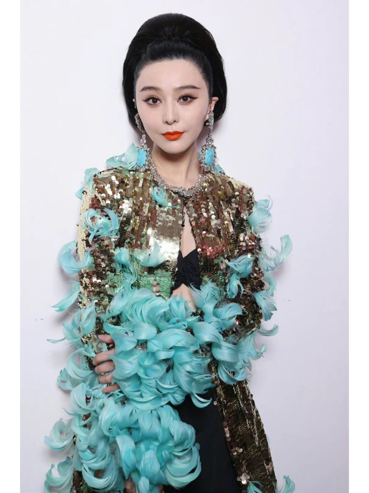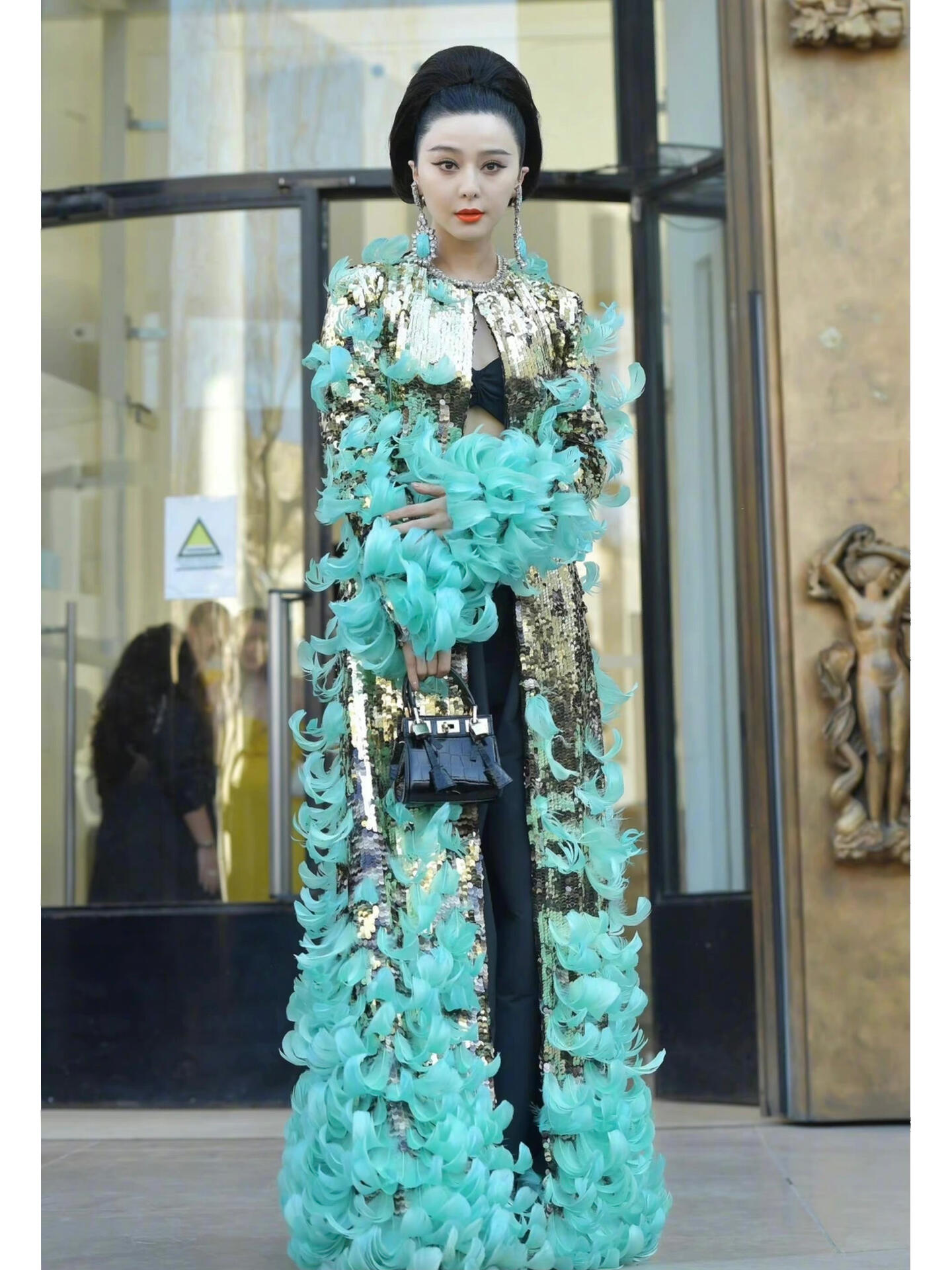 范冰冰巴黎时装周秀场,金色亮片长袍,缀满碧绿羽毛,足够美艳华丽的高定造型。