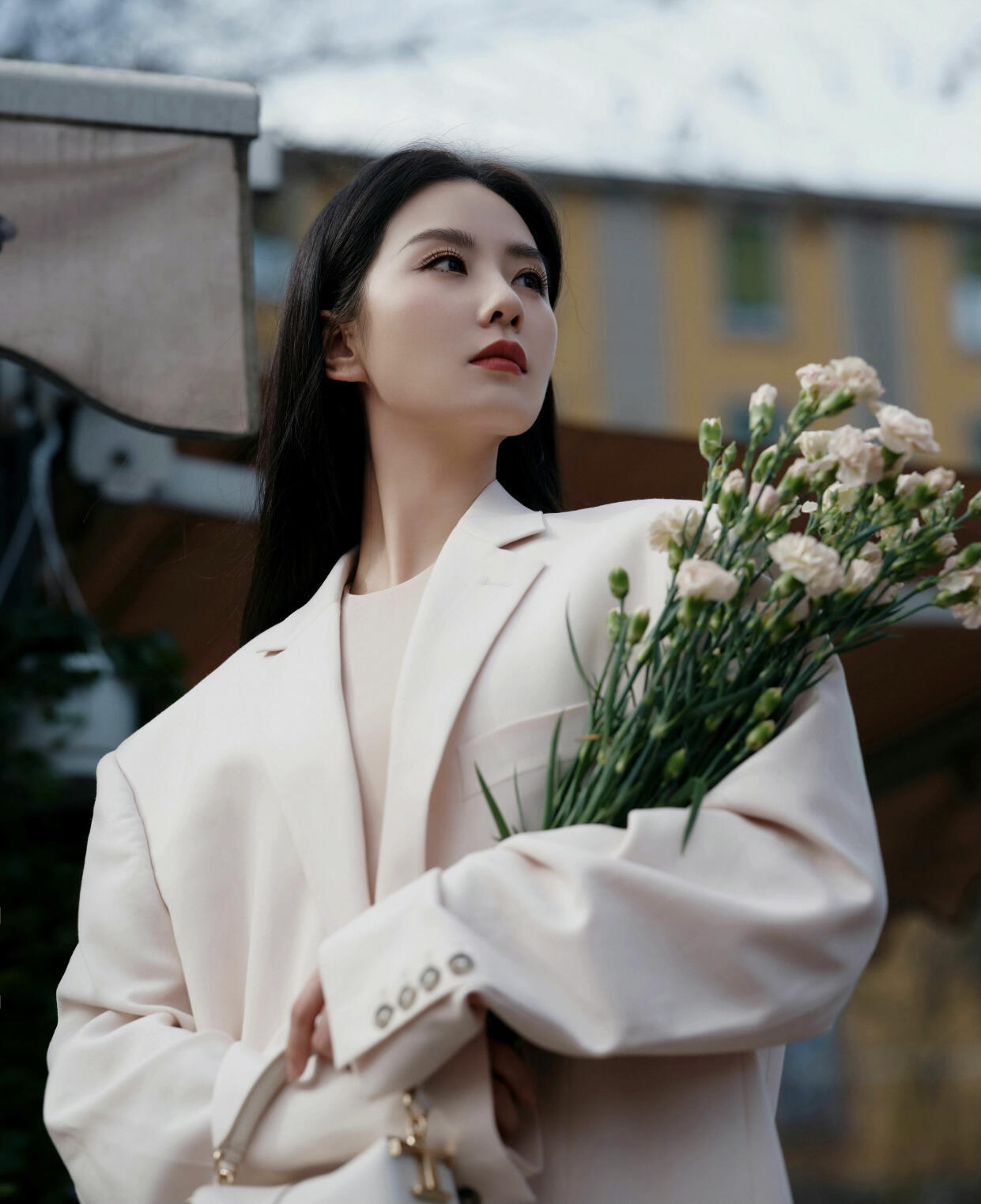 在花店前的刘诗诗,西装长裙虽优雅,却让人想起花开花落的短暂,美丽总是易逝。