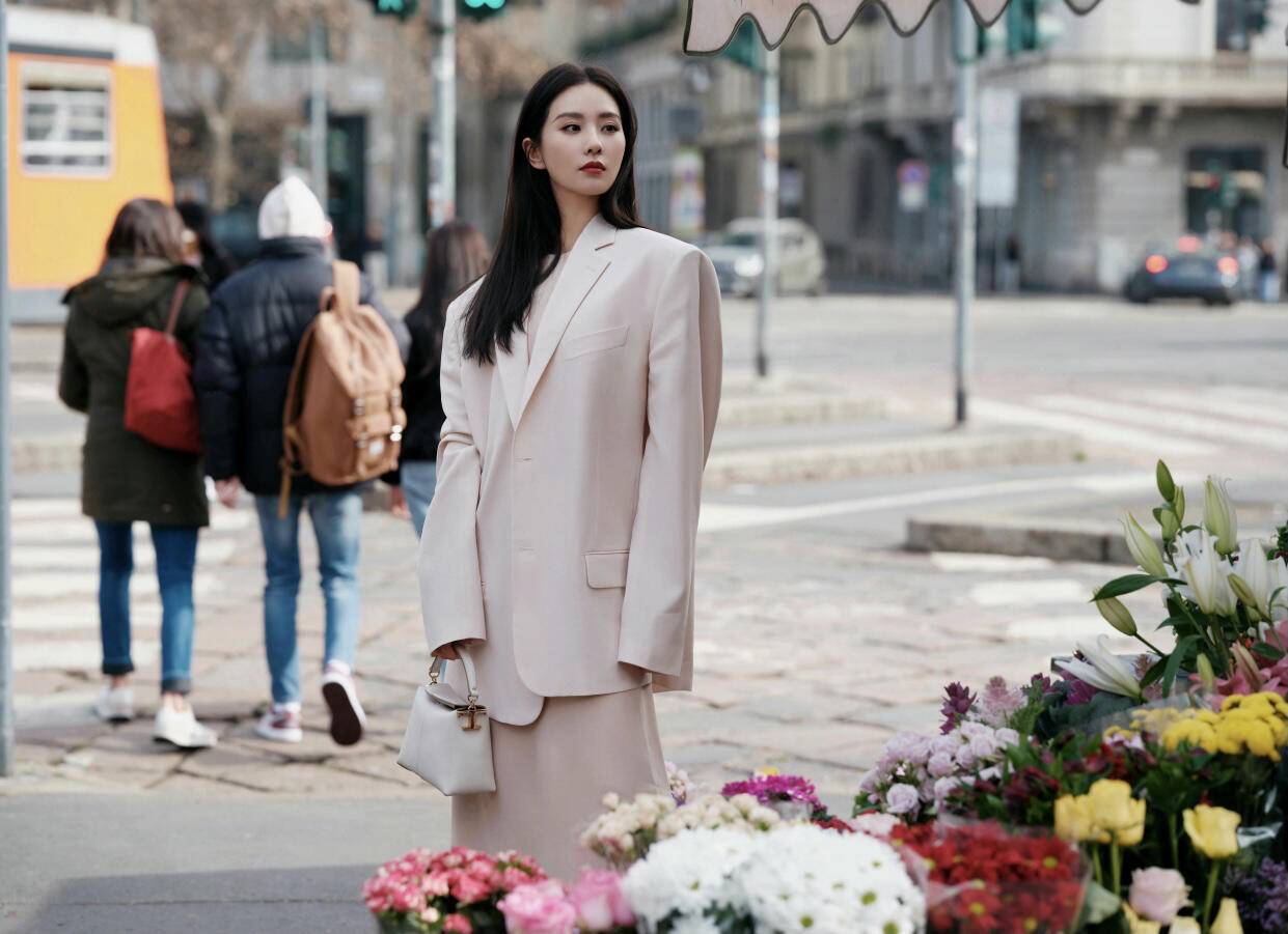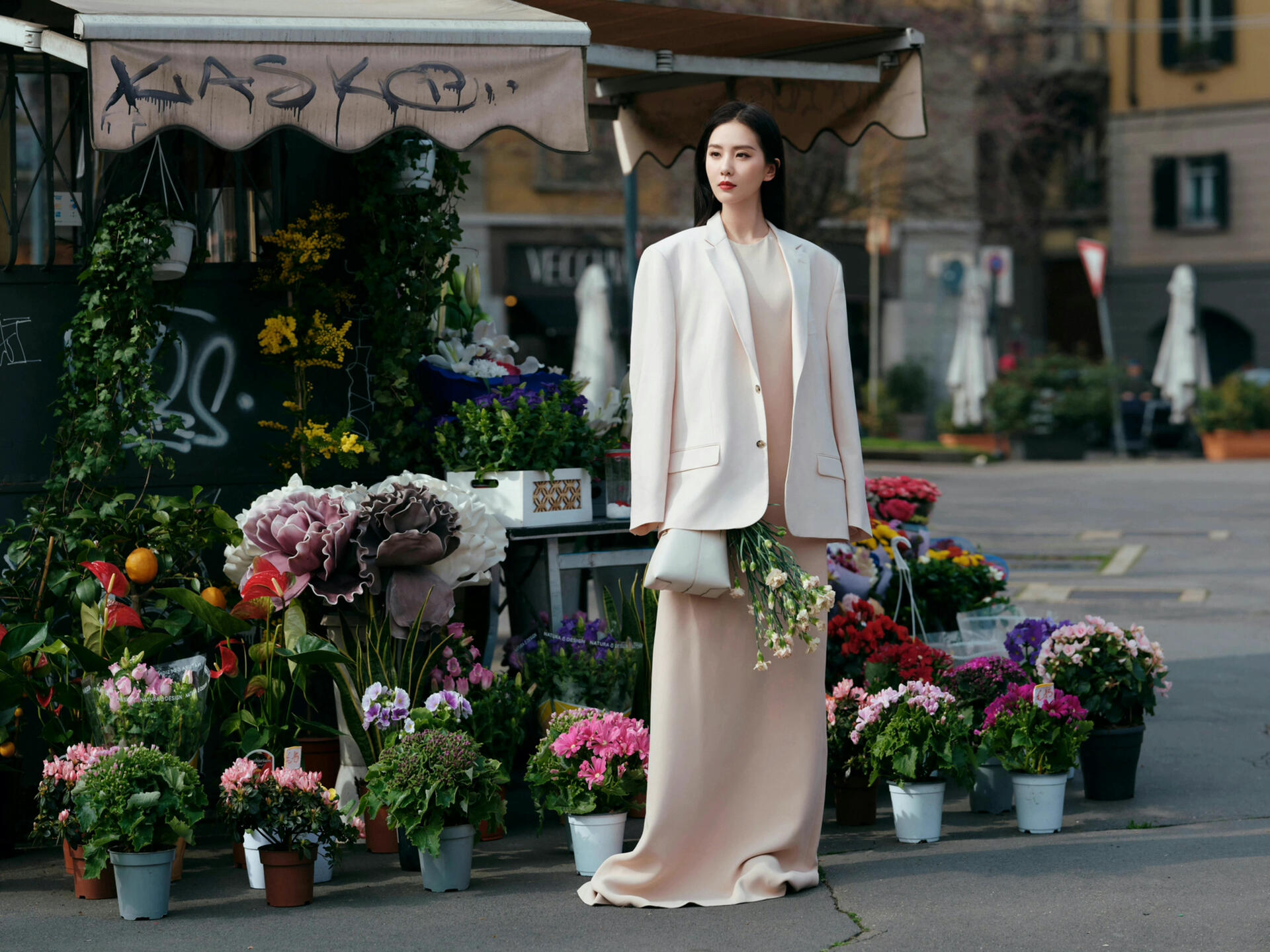刘诗诗米兰晚宴造型图集,街头花店、西装长裙… 优雅如“诗”的浪漫时刻。