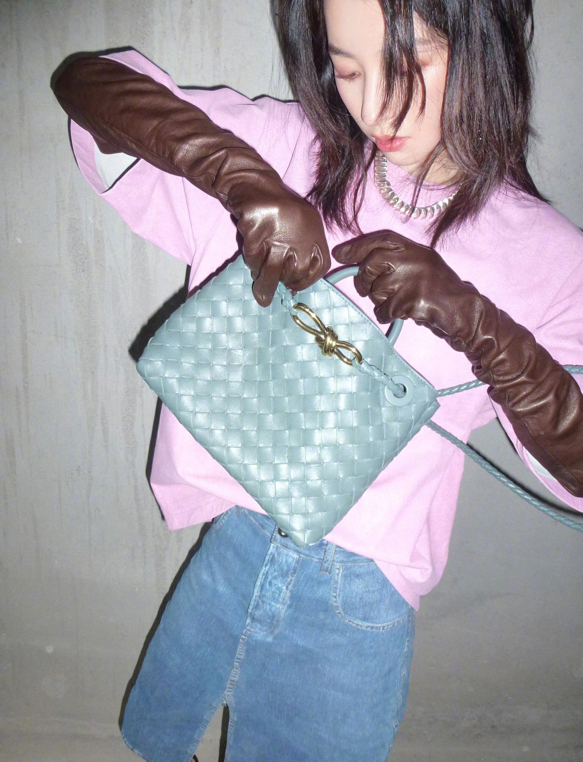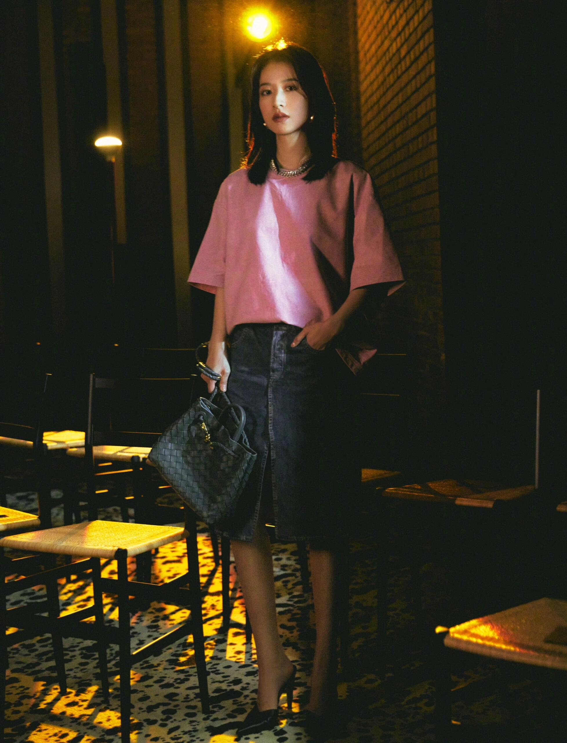 周雨彤粉色上衣配牛仔裙,搭配皮手套和尖头高跟,简约利落又不失时髦感,摩登都市女郎的穿搭示范