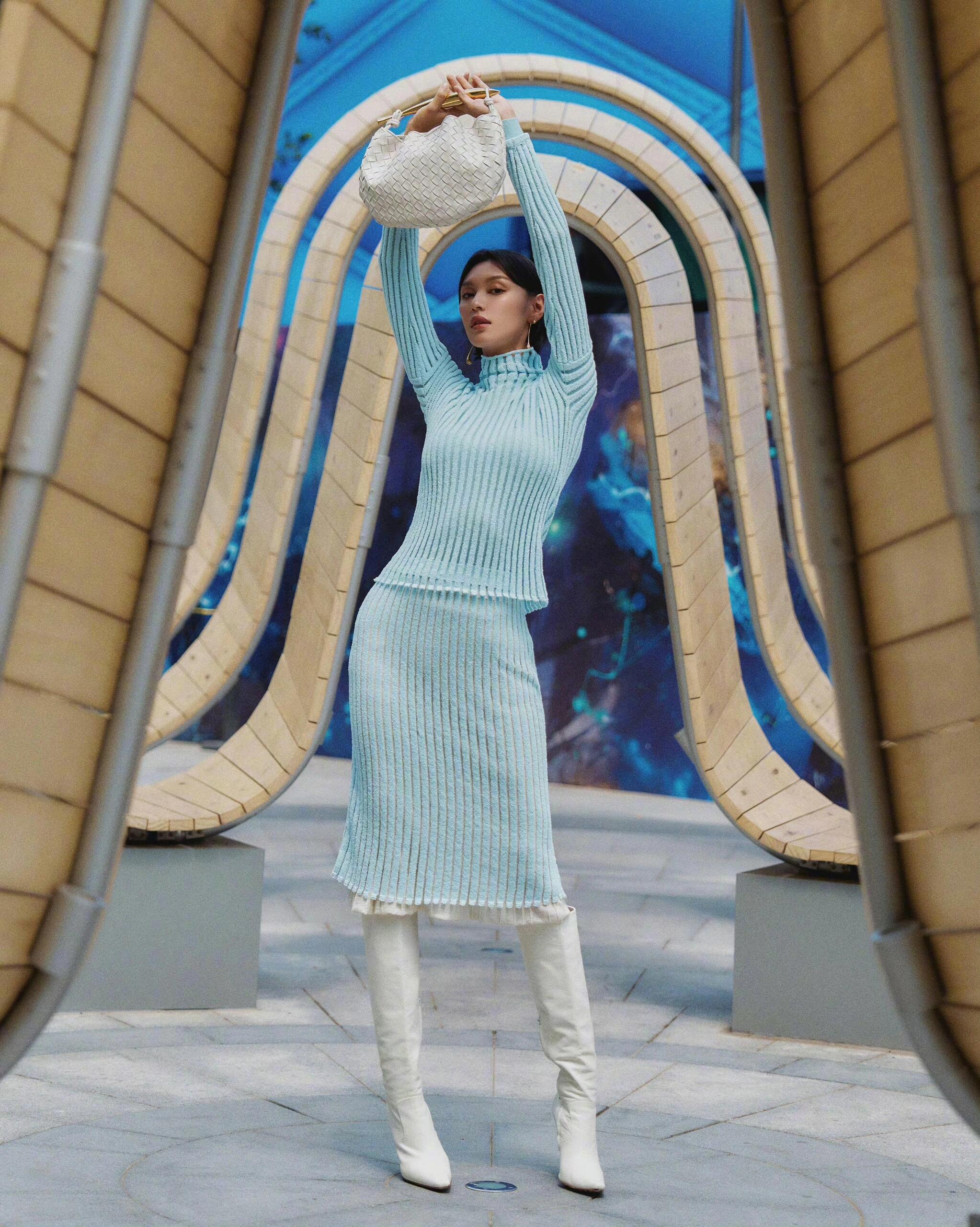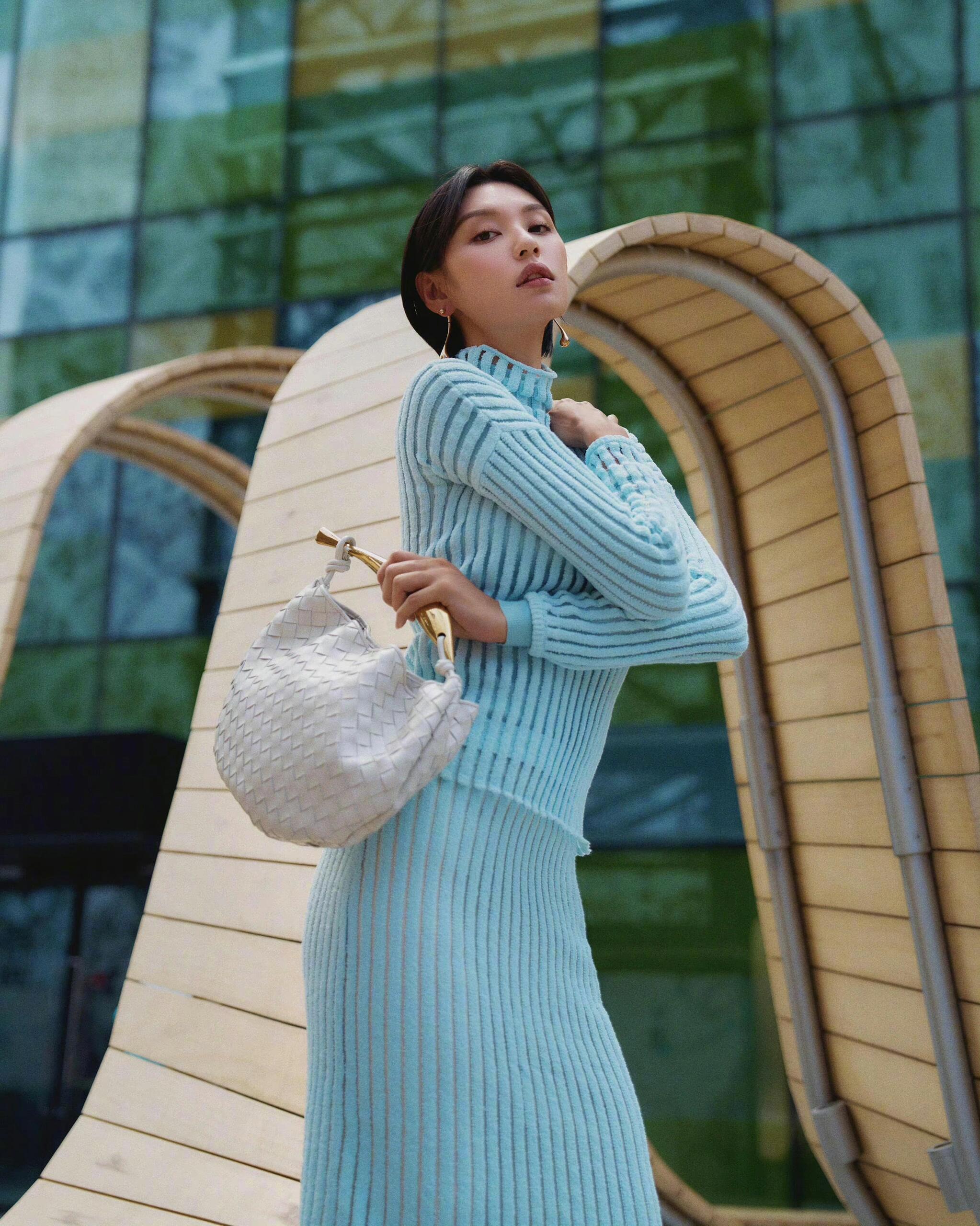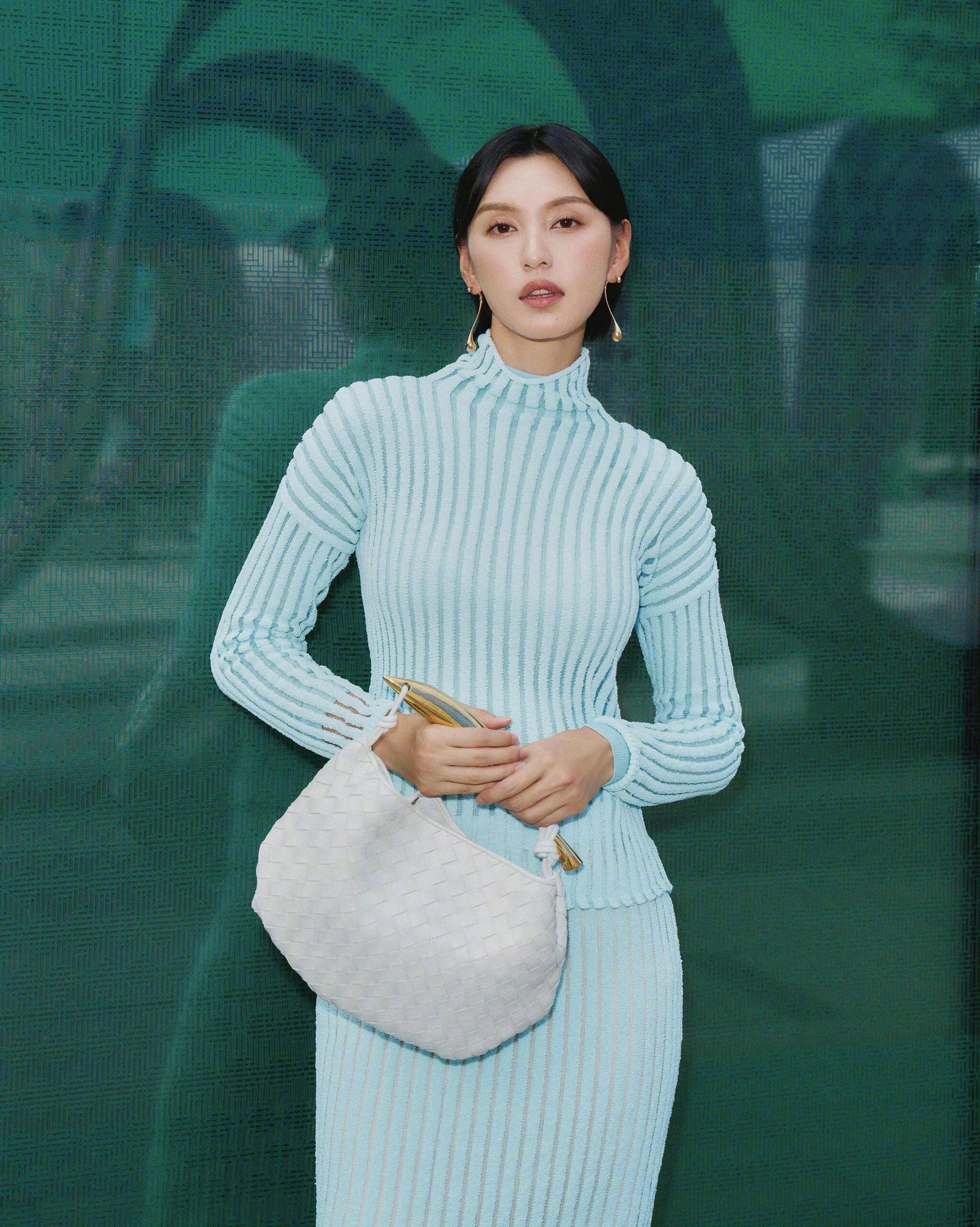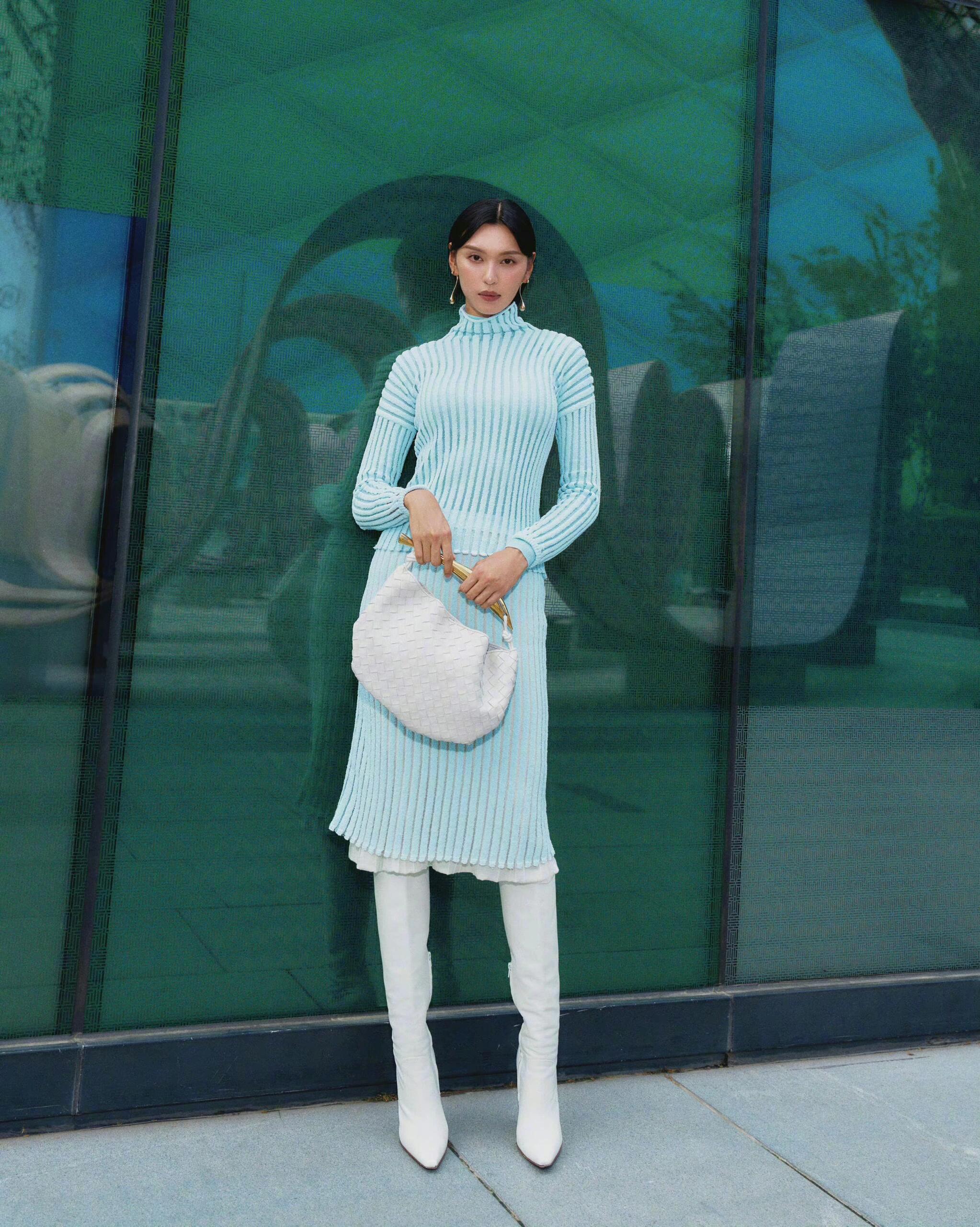 王丹妮,一身蓝色条纹针织裙装,搭配白色长靴,尽显她模特出身的高挑身段和气质,简练又时髦~