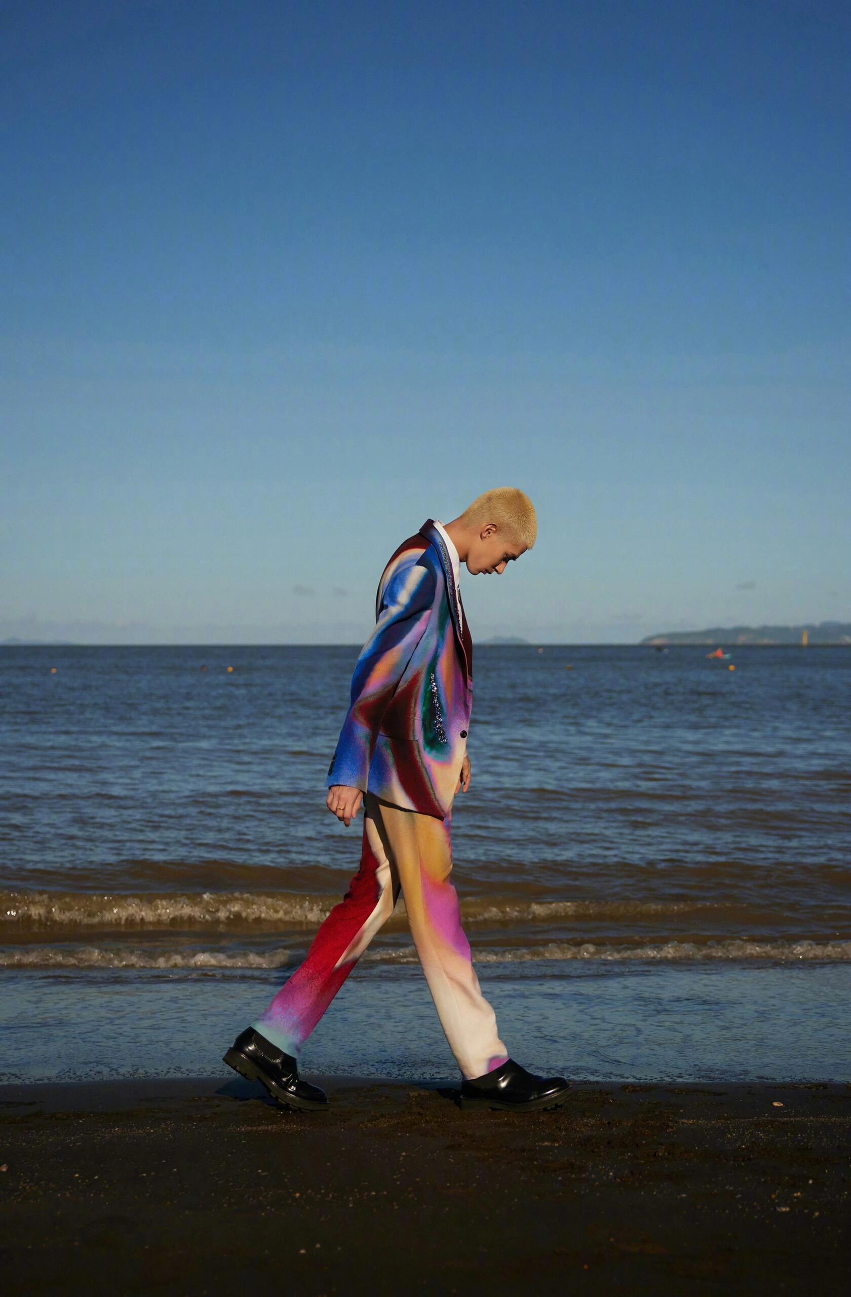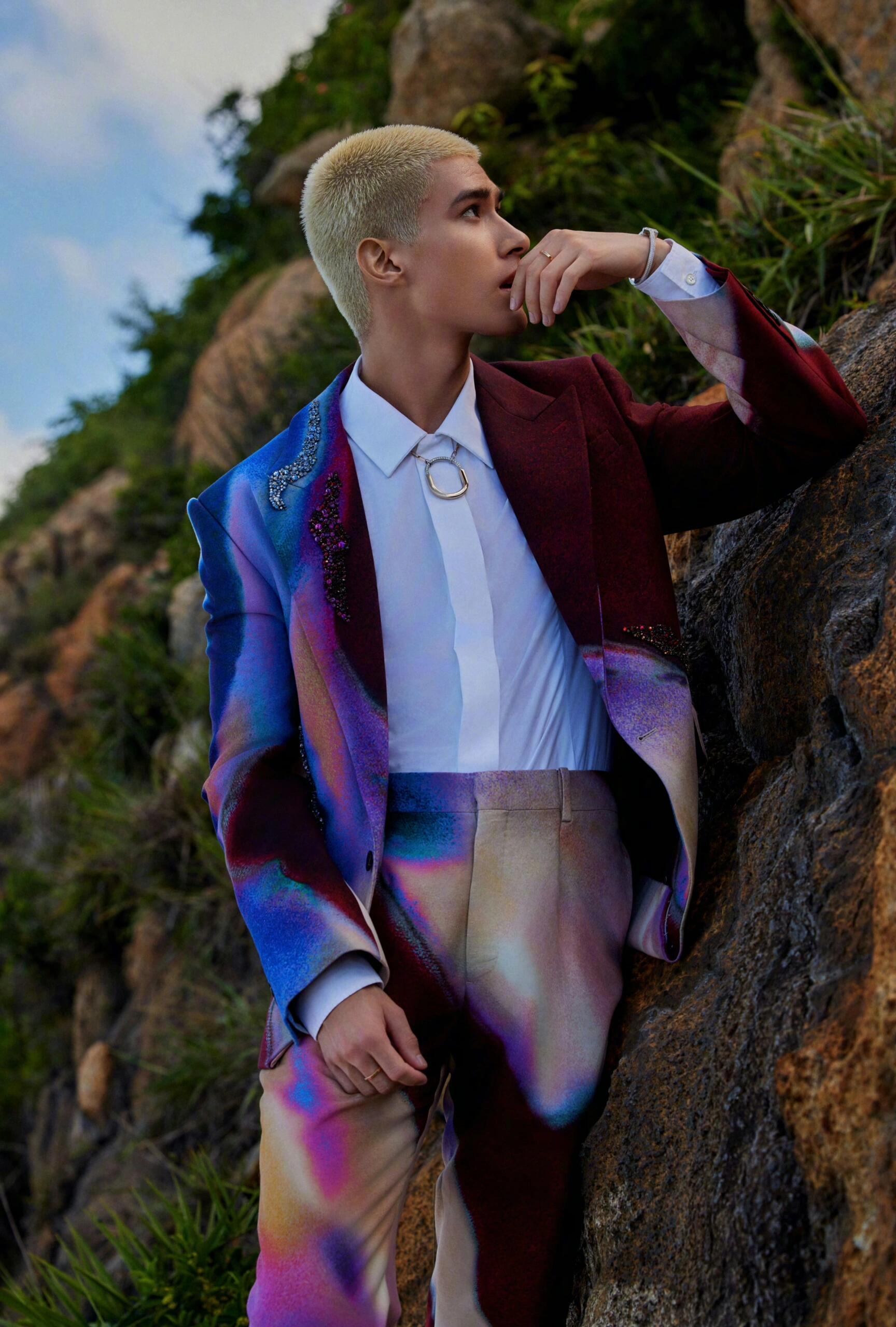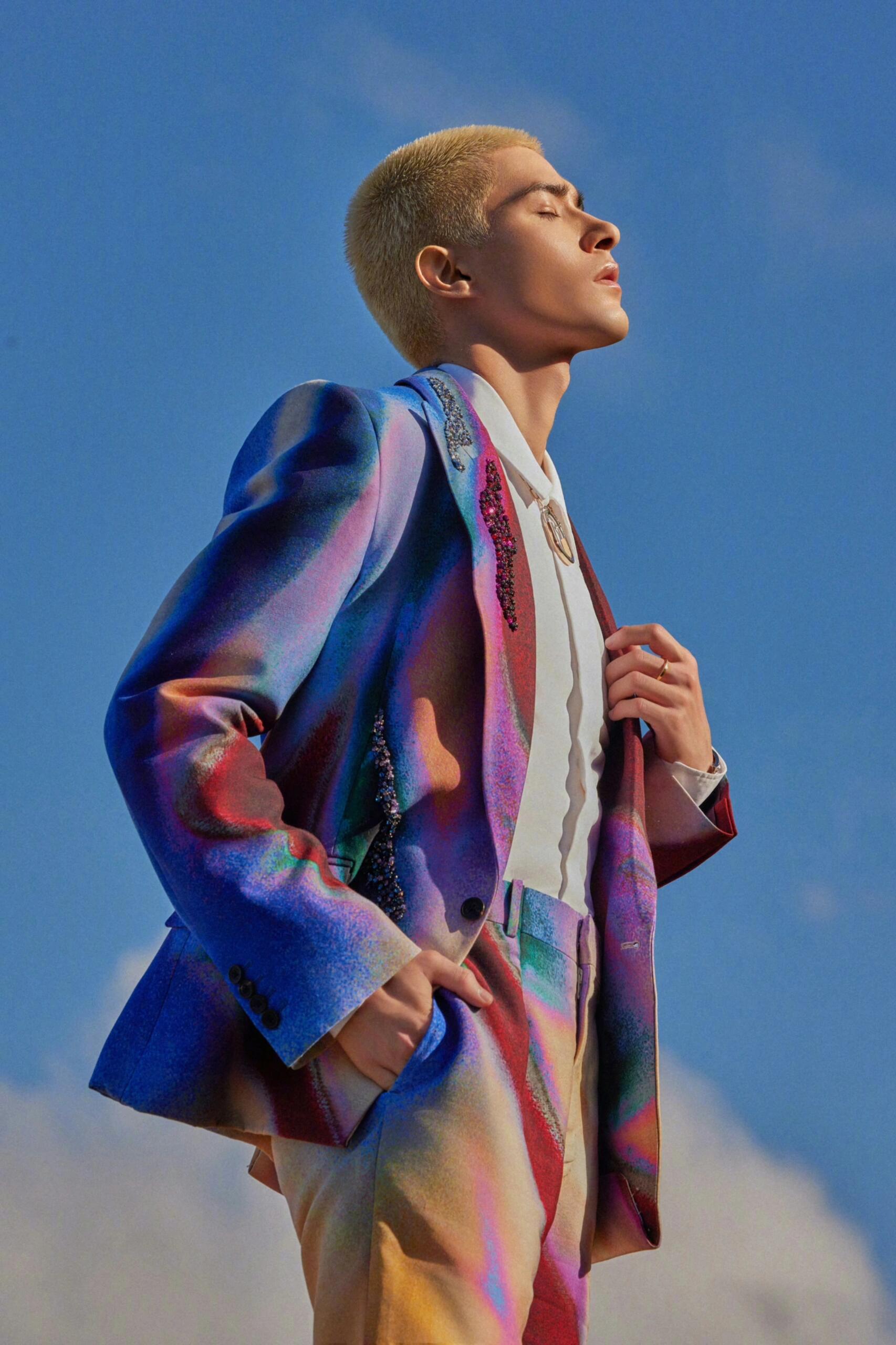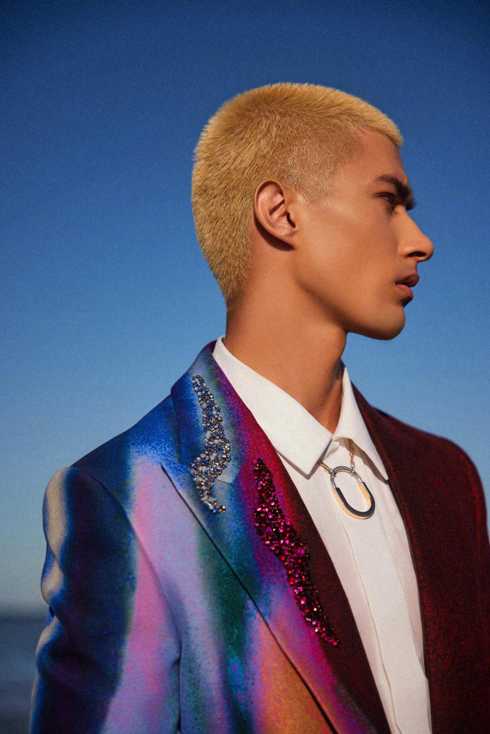 米卡,穿着男装出镜,石榴红抽象花卉印花精裁西装,点缀璀璨水晶刺绣,佩戴珠宝增添细节质感,浪漫又精致的舞台造型