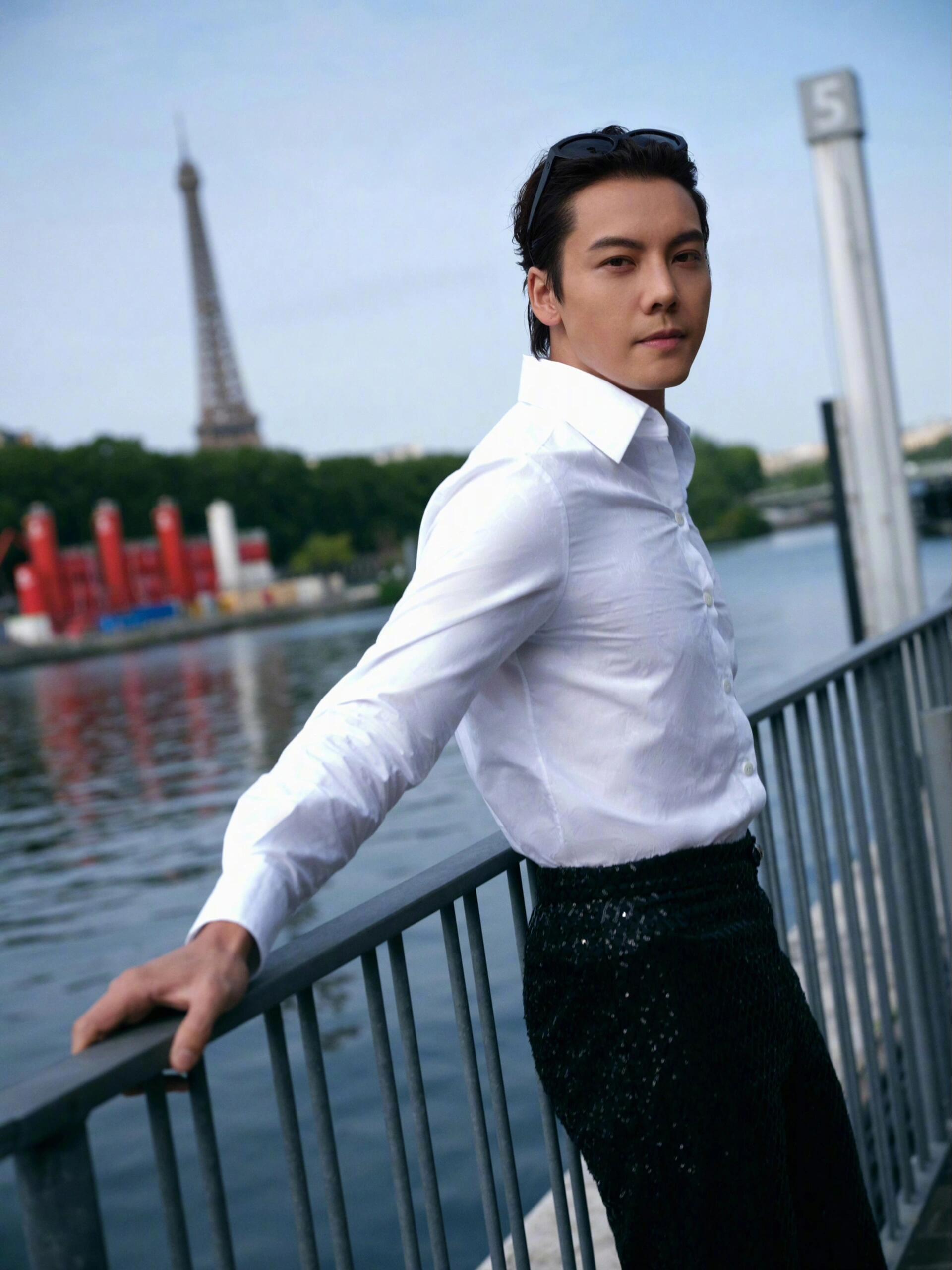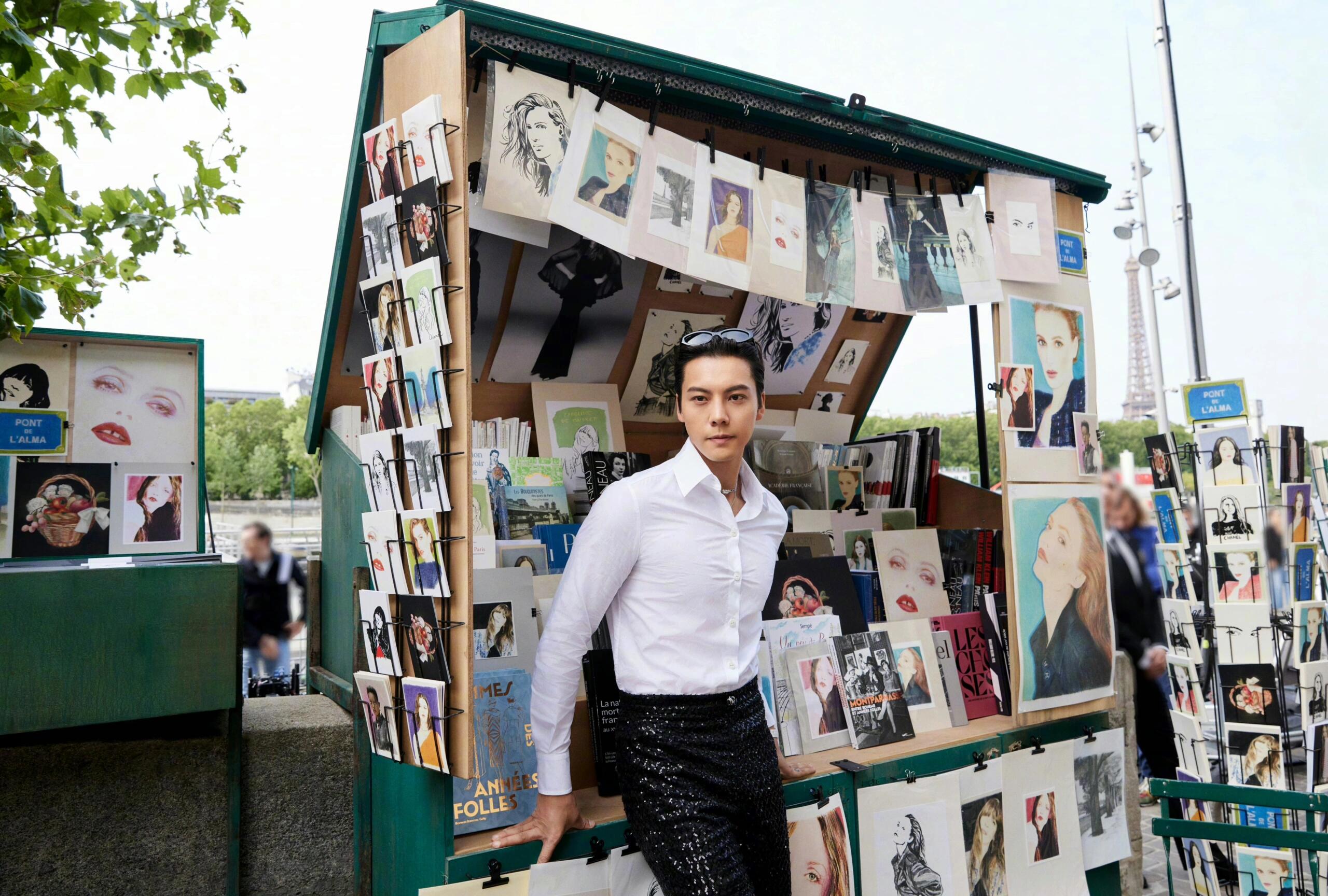 陈伟霆,白衬衫配黑色亮片裤,佩戴着珠宝,香家阔少的巴黎行。
