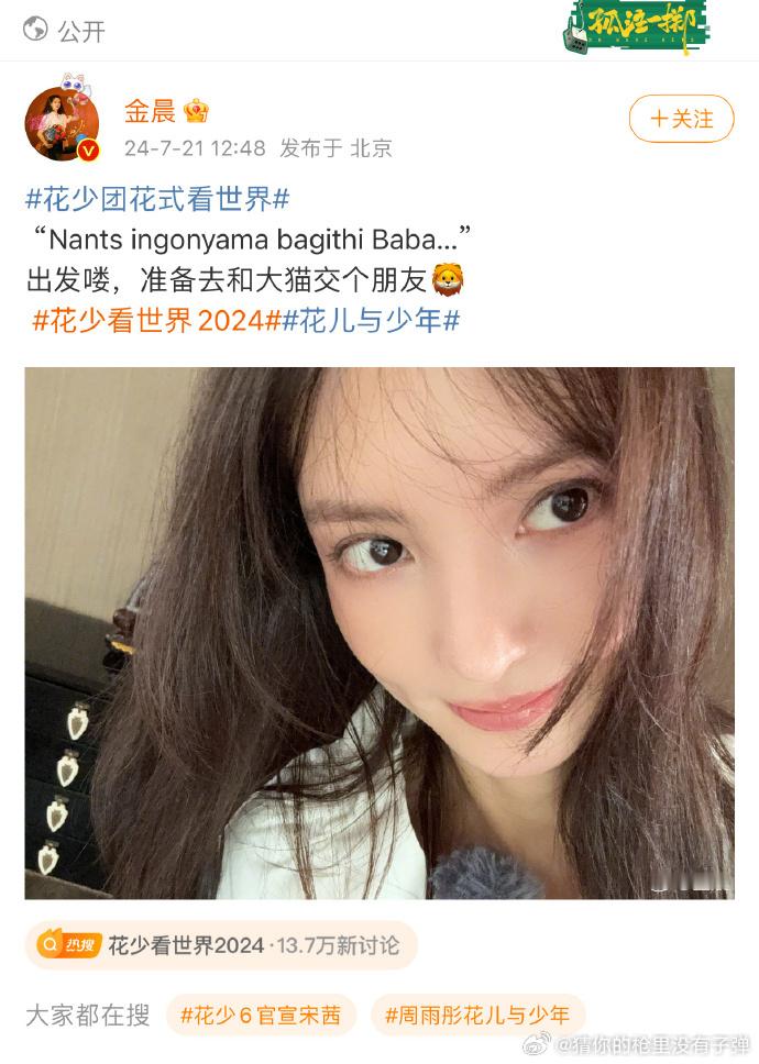 #金晨要去坦桑尼亚看狮子了# 金晨官宣参与花少6,“Nants ingonyama bagithi Baba…”传递出她的喜悦与向往。坦桑尼亚之行近在眼前,金晨的狮子王歌词体现她对见到狮子的急切心情!