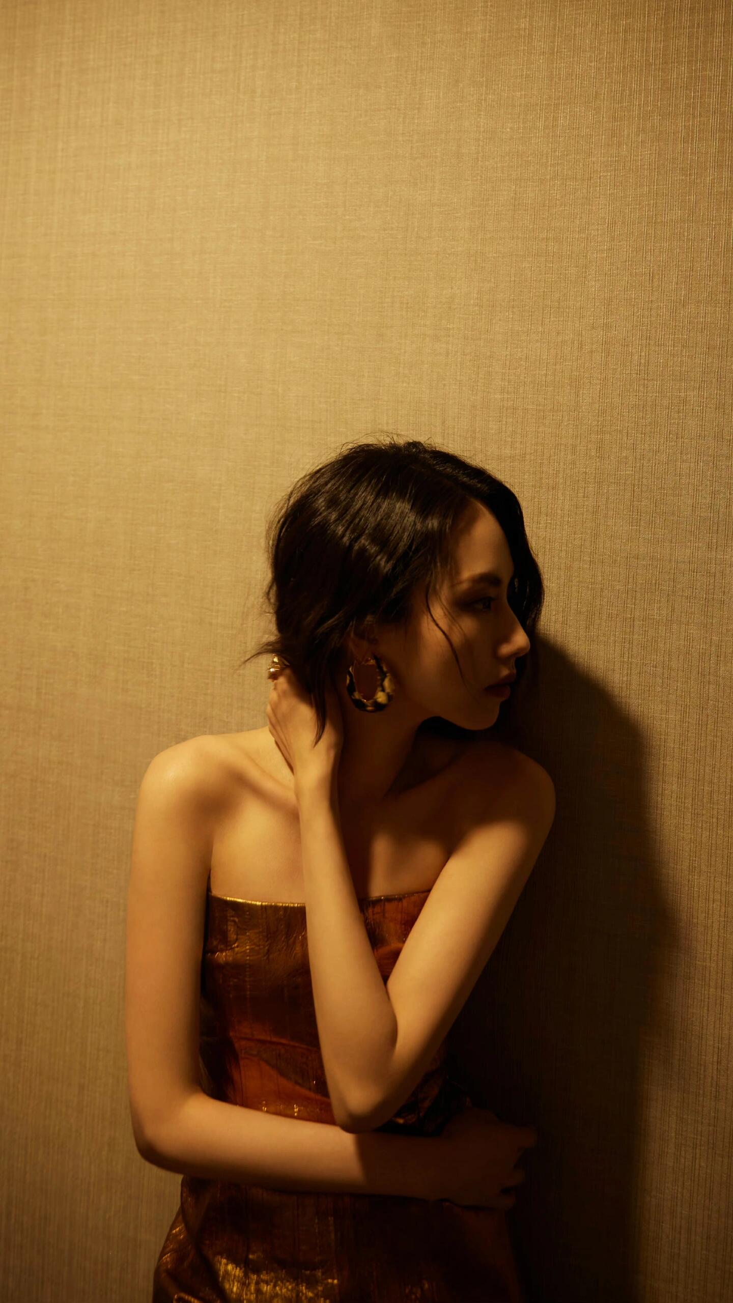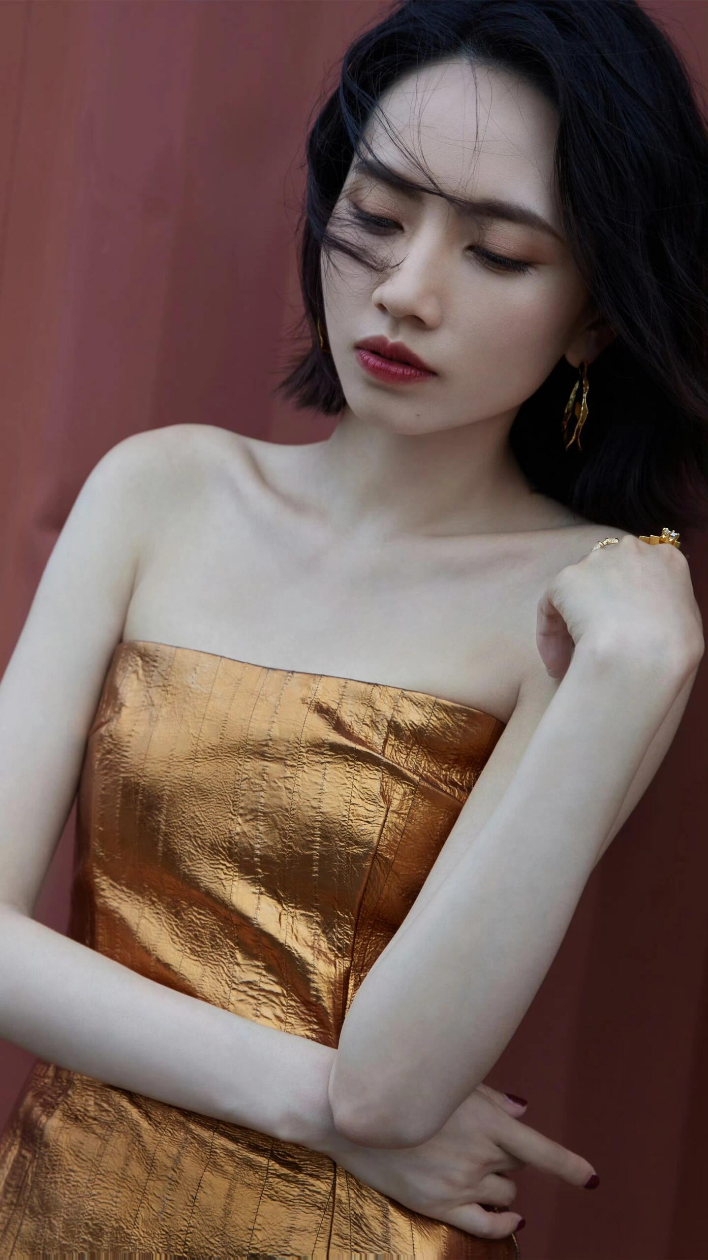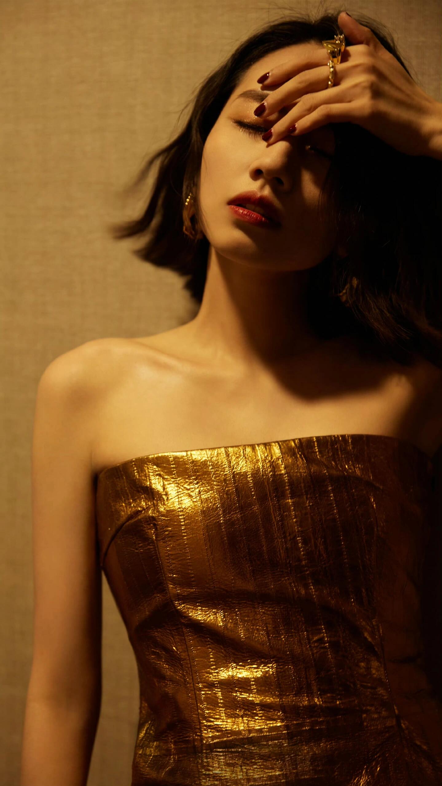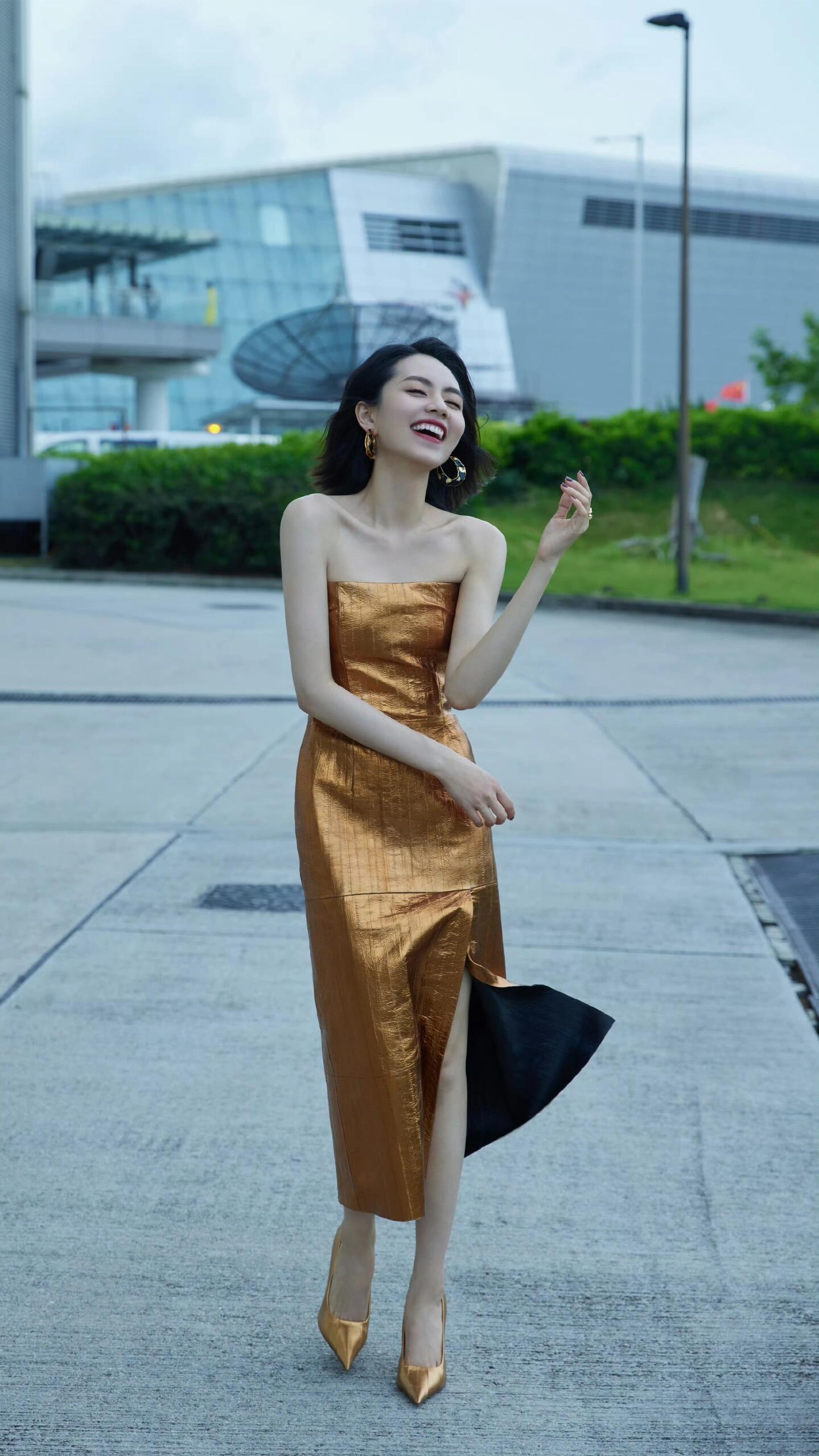 一席复古金色抹胸长裙,充满质感的光泽面料,华贵又时尚,锁骨显露得刚刚好,真是美得毫不费力!