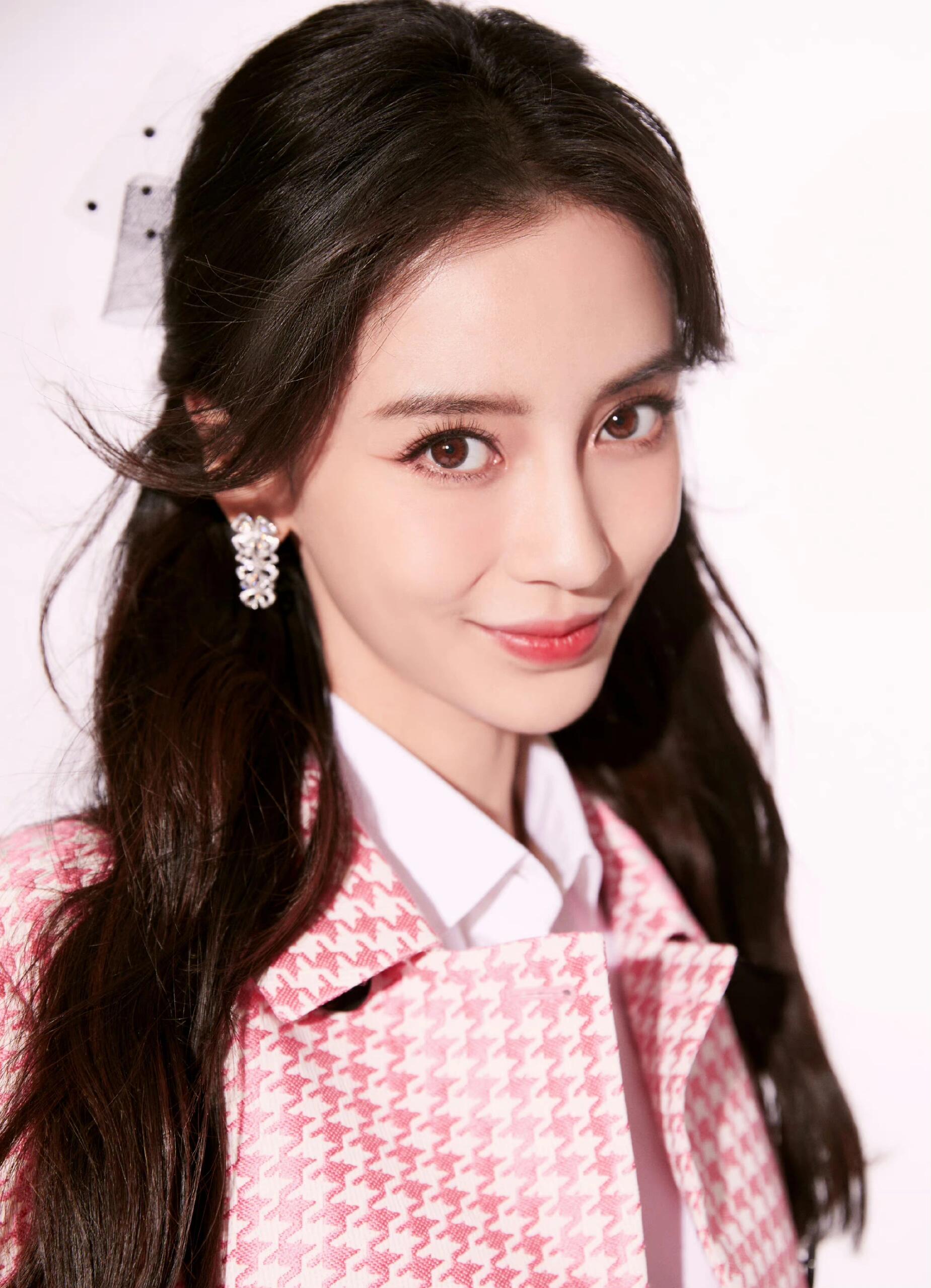 杨颖Angelababy个人写真 粉色千鸟格套装,搭配蝴蝶结发饰,活泼可爱,阳光大气。