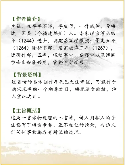 这是一首咏物说理的七言诗,诗人用拟人的手法描写了梅雪争春、互不相让的情景,告诉人们任何事物都各有所长的道理。