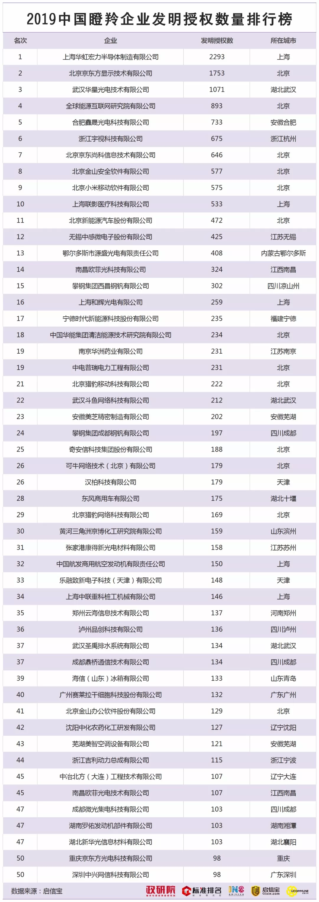 瞪羚企业其中最大的一个特质是创新。创新除了商业模式的创新,更多的体现在于发明专利等申请授权量上,因此,《瞪羚报告》也对此做了一个解析。按照现有的数据,发布机构制作了瞪羚企业发明授权数量的排名,其中排在第一位的是上海华虹宏力半导体制造有限公司,这是一家世界领先的8英寸晶圆代工厂,它的发明授权数量是2293。