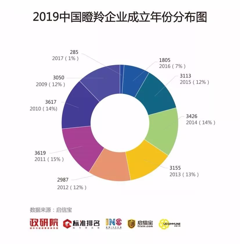 对于初创企业而言,迈过三、四年这个大坎,基本上就算比较安全了。瞪羚企业通常就是在迈过这道坎之后进入了飞速发展的时期。因此,数据显示,刚刚迈过这道坎就入选瞪羚企业的数量不多,2017年成立的企业中只有285家入选,占所有瞪羚企业的1%。2011年成立的企业最多,有3619家,其次是2010年、2014年、2013年,意味着成立五至八年的企业容易迈入高速增长的时期。