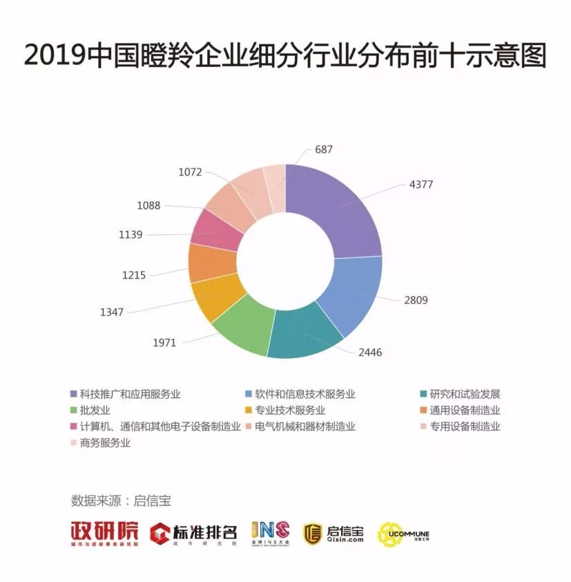 对于瞪羚企业的行业,《瞪羚报告》是按照国民经济行业分类与代码进行划分,其中剔除了房地产业、国际组织等,分布在15的大的行业,73个细分行业。数据显示,制造业的瞪羚企业数量最多,高达9577家,占比38.22%;科学研究和技术服务业8170家,占比32.61%;信息传输、软件和信息技术服务业有2996家,占比11.96%。