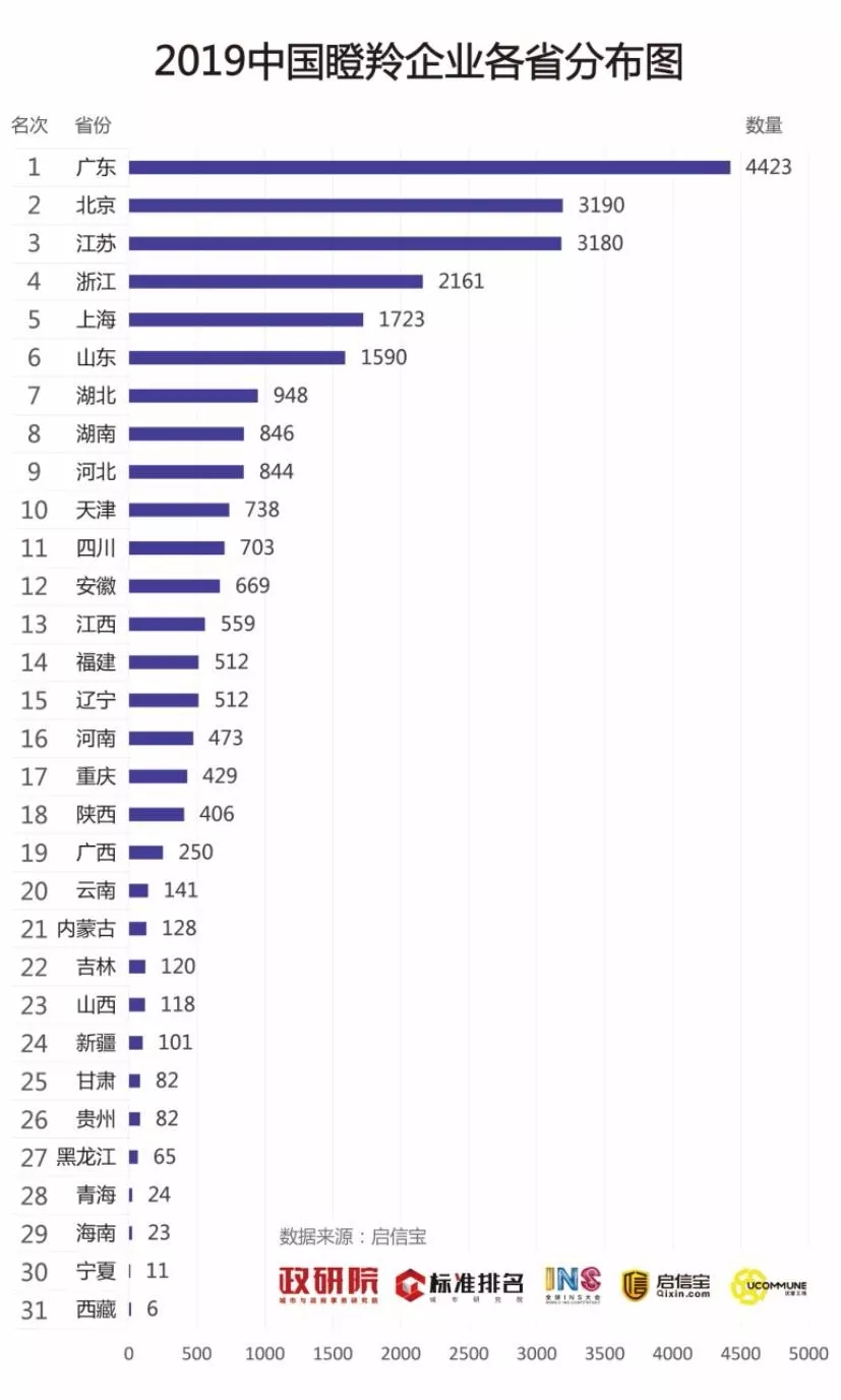 《瞪羚报告》数据显示,这25057家瞪羚企业分布在中国大陆的31个省(市区),其中广东省以4423家瞪羚企业高居全国首位,北京和江苏分别以3190家、3180家紧随其后。数量过千家的省(市区)还包括浙江、上海和山东。东北经济潜力的颓势依然存在。数据显示,东北三省仅有辽宁的瞪羚企业数量超过512家,位居全国中位;吉林118家,位居中后段;黑龙江为65家,仅高于西部的青海、宁夏和西藏。东北三省的总和没能超过700家,不及杭州一个城市的数量。
