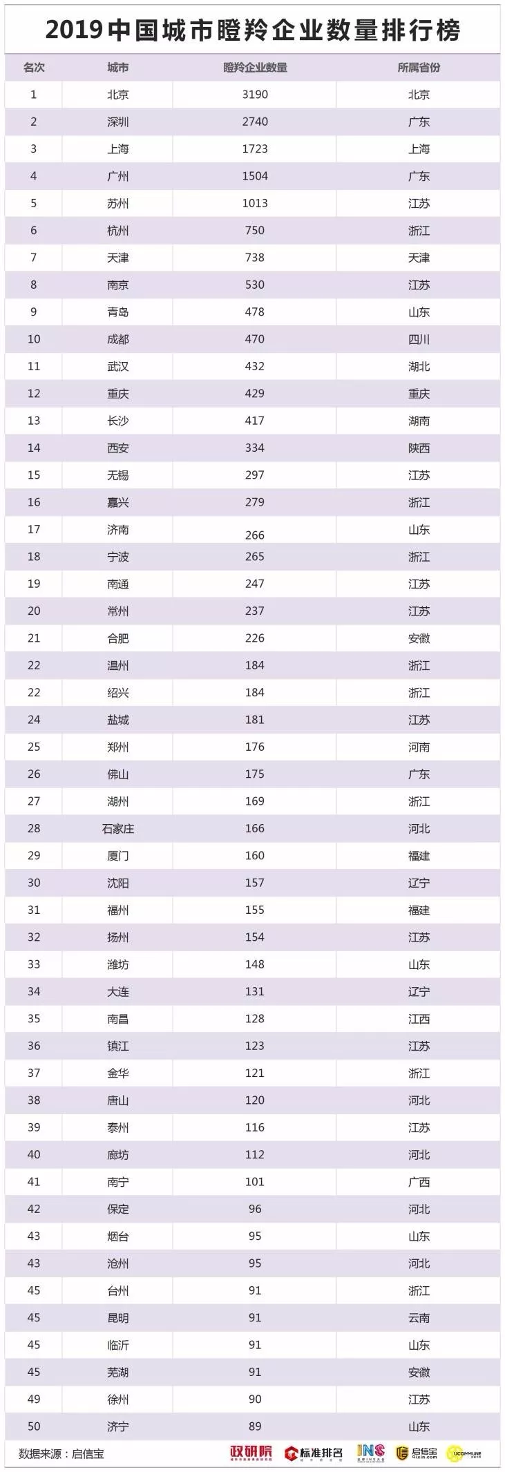 所谓瞪羚企业,按照瞪羚报告发布机构的定义,就是成长性极好、创新性够强的高新技术类企业,如同动物界中的瞪羚羊一般善于跳跃和奔跑。根据发布机构制订的标准,从启信宝的数据库里进行了数据筛选,最终有25057家高新技术企业成为2019年中国瞪羚企业。据全球INS大会研究院院长、标准排名城市研究院院长谢良兵介绍,他们对于瞪羚企业的定义有如下几个标准:一是成立时间在十年以内;二是必须高新技术企业;三是排除大型央企、房地产企业以及部分资源垄断性企业;四是年增长率不低于20%或上一年度总收入不低于5000万。中国各地正在鼓励培育瞪羚羊企业。两个月前,中共中央政治局常委、国务院总理李克强在其主持召开的经济形势专家和企业家座谈会上表示,要创造有利条件,催生更多“独角兽企业”、“瞪羚企业”、新领军者企业,加快新动能培育和新旧动能转换。