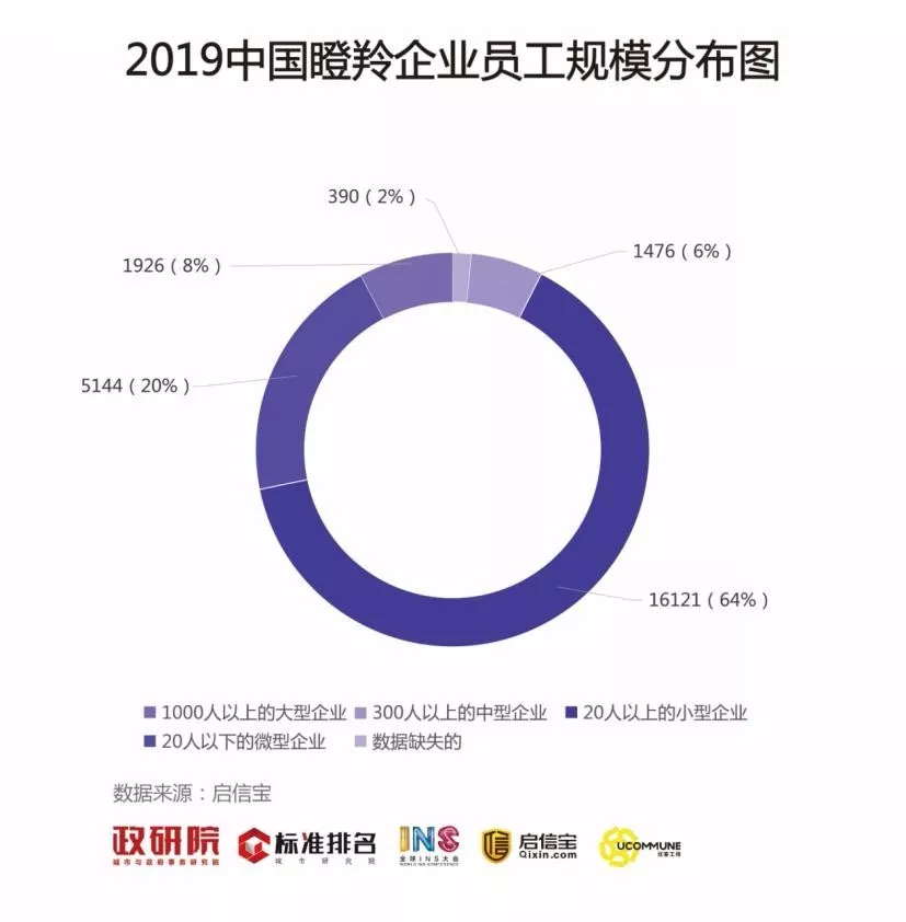 关于企业员工规模,此次发布的榜单以社保人数为依据。数据显示,入选的25057家瞪羚企业中有23131个企业有社保人数数据,其中从业人员1000人以上的大型企业有390家;从业人员300人以上的中型企业有1476家;从业人员20人以上的小型企业有16121家;从业人员20人以下的微型企业为5144家。由此可见,符合瞪羚企业标准的大多为小微企业。