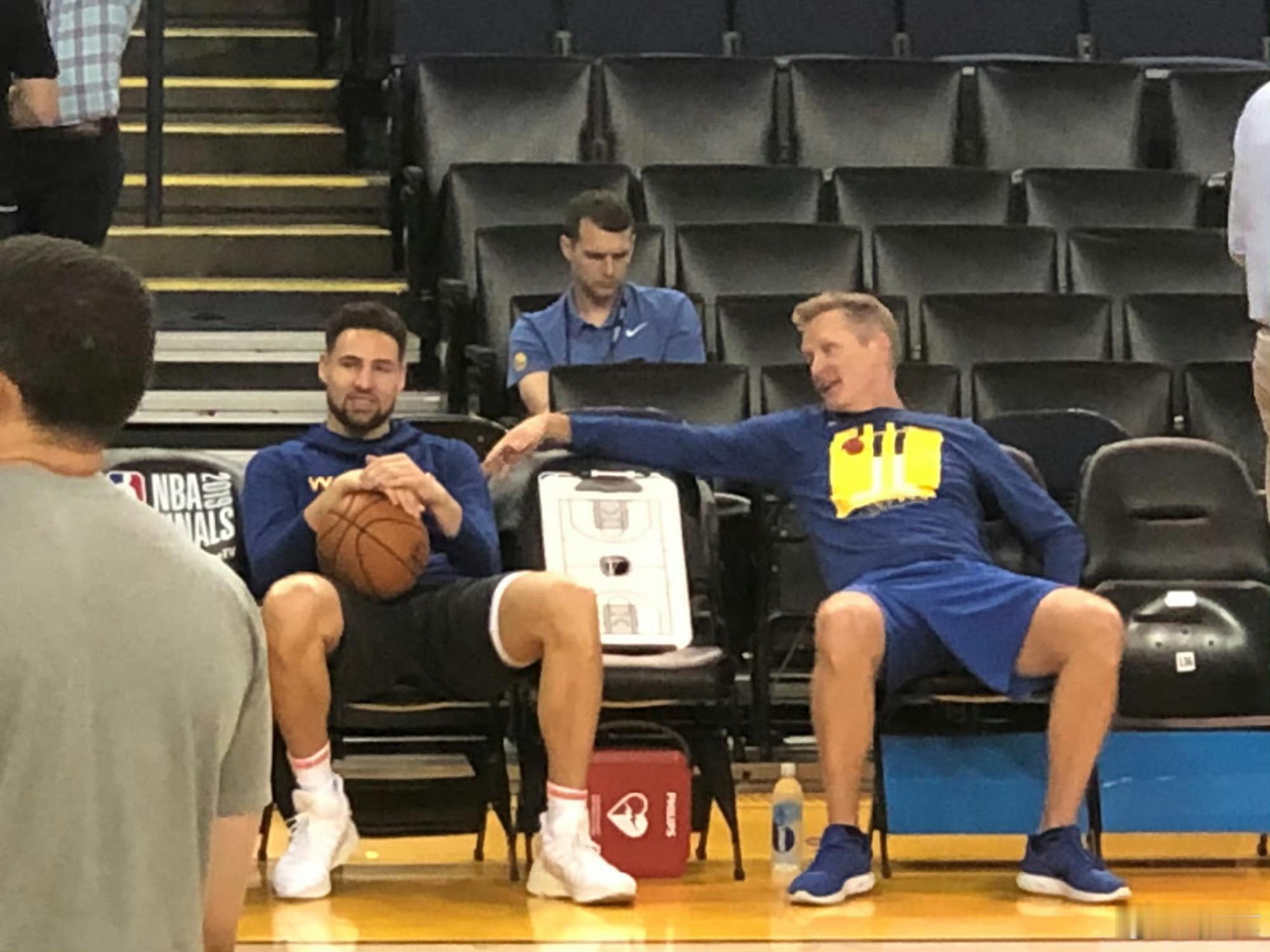 图4,2019年,“宇宙勇”与猛龙的总决赛,克雷十字韧带断裂前的赛前,与科尔聊天。我在场边拍的照片。