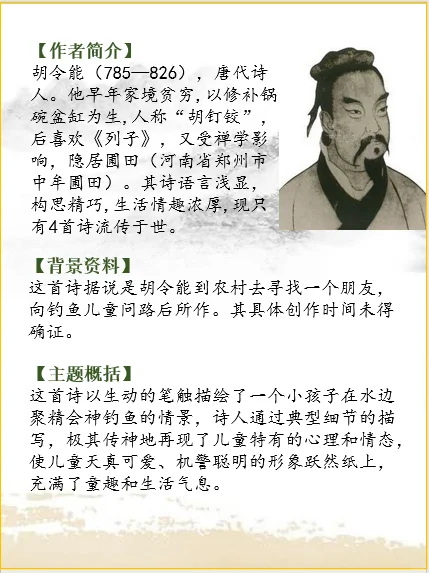 这首诗据说是胡令能到农村去寻找一个朋友,向钓鱼儿童问路后所作。其具体创作时间未得确证。