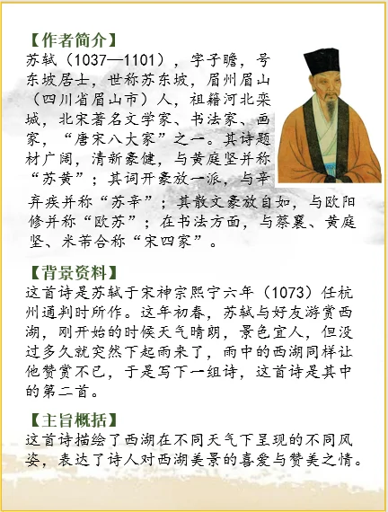 这首诗是苏轼于宋神宗熙宁六年(1073)任杭州通判时所作。这年初春,苏轼与好友游赏西湖,刚开始的时候天气晴朗,景色宜人,但没过多久就突然下起雨来了,雨中的西湖同样让他赞赏不已,于是写下一组诗,这首诗是其中的第二首。