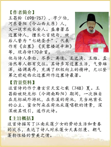 这首诗约作于唐玄宗天宝七载(748)夏。王昌龄被贬龙标(今湖南黔阳)期间,一次独自在龙标城外游玩,在东溪的荷池,见当地酋长的公主、蛮女阿朵在荷池采莲唱歌的情景,深深被其吸引,遂作此诗。