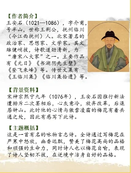 宋神宗熙宁九年(1076年),王安石因推行新法遭排斥二次罢相后,心灰意冷,放弃改革,后退居钟山。此时他的心情与傲雪凌霜的梅花有着共通之处,因此有感写下此诗。