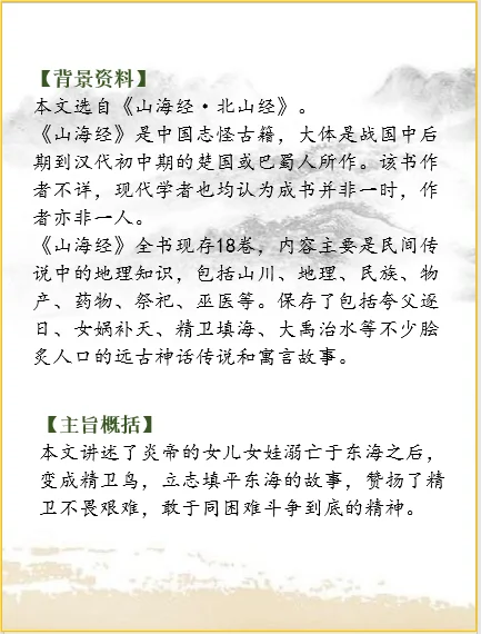 本文讲述了炎帝的女儿女娃溺亡于东海之后,变成精卫鸟,立志填平东海的故事,赞扬了精卫不畏艰难,敢于同困难斗争到底的精神。