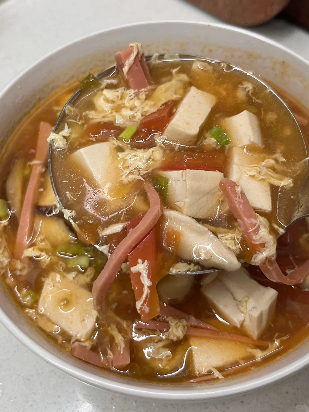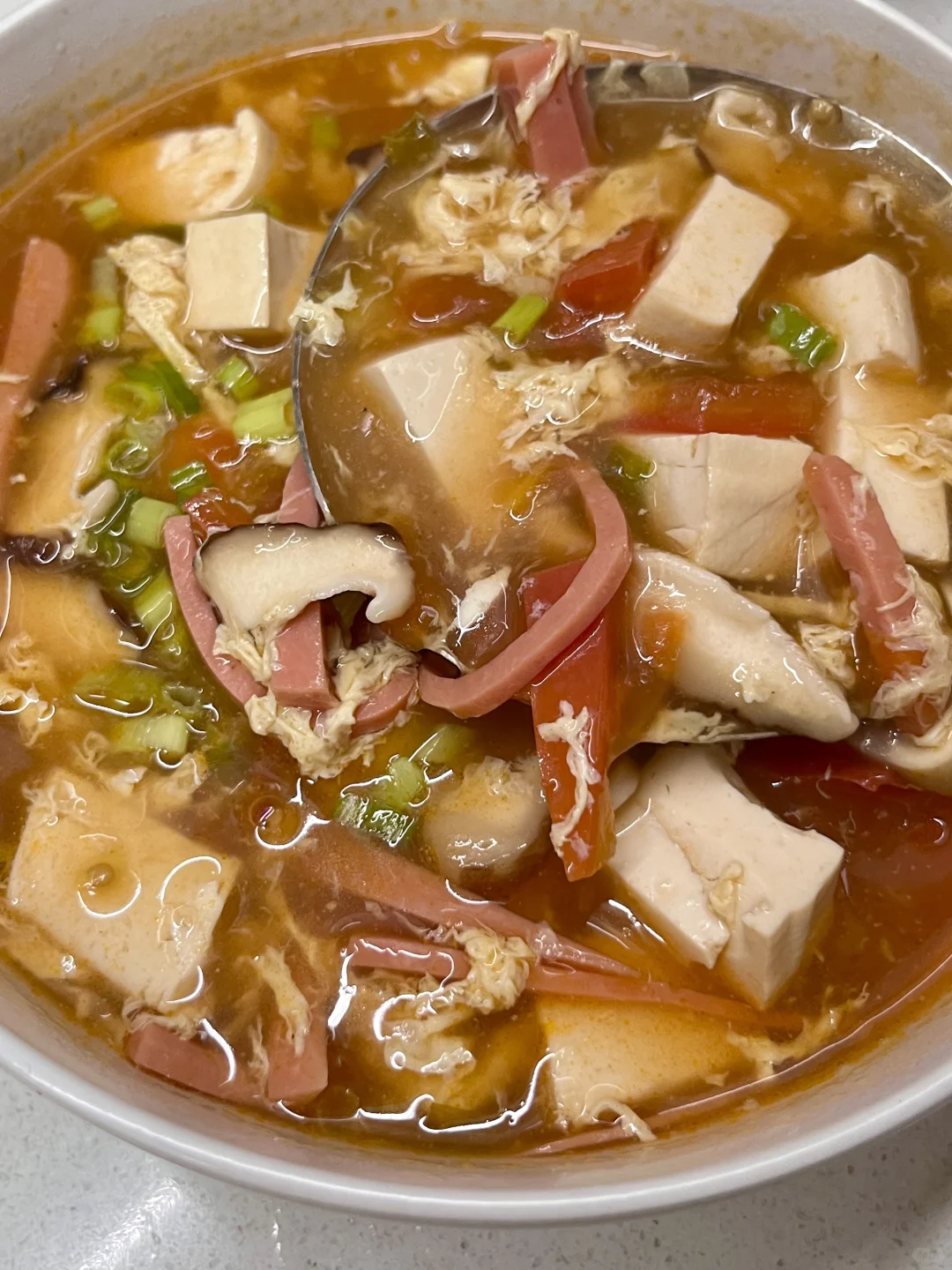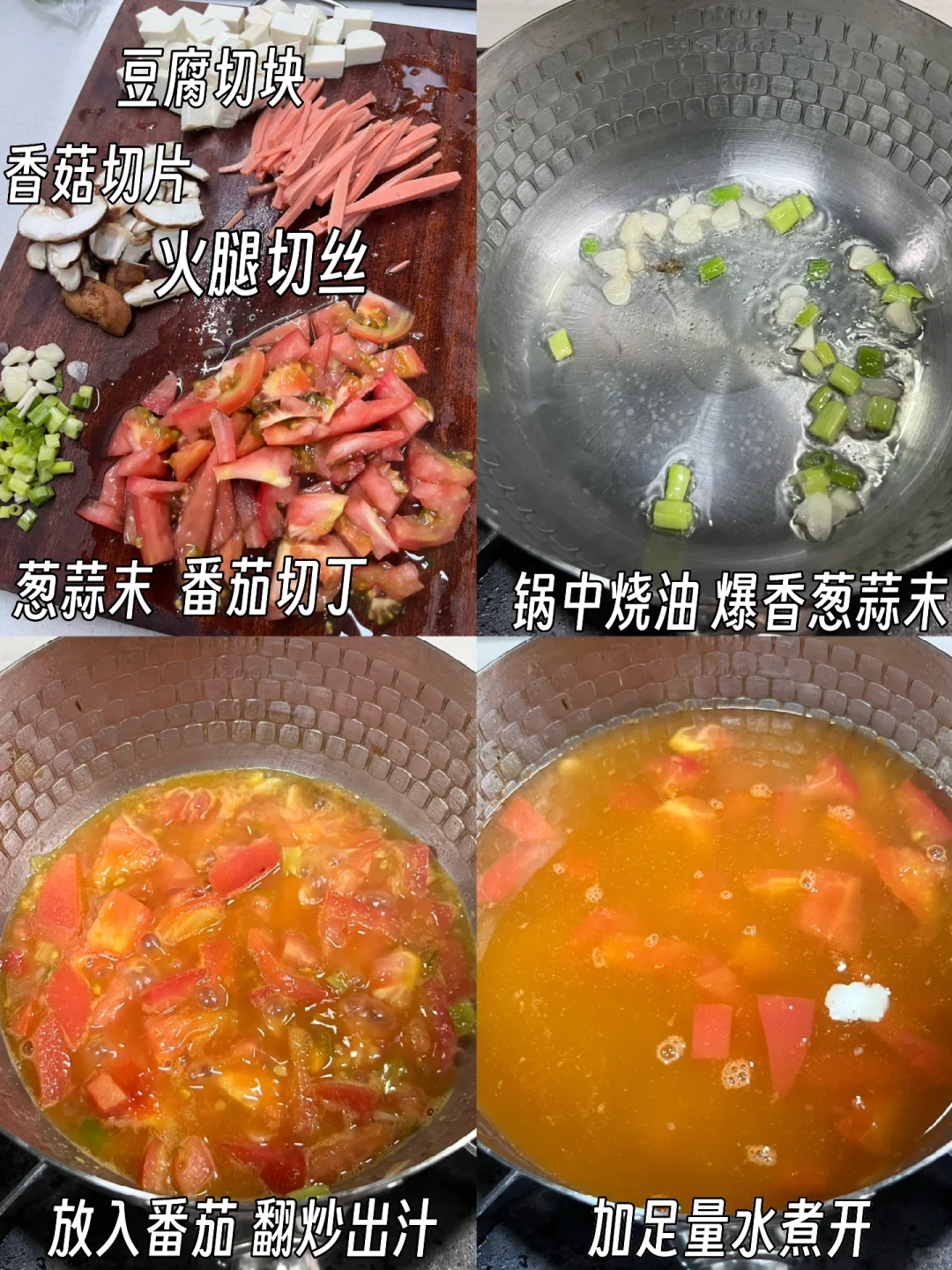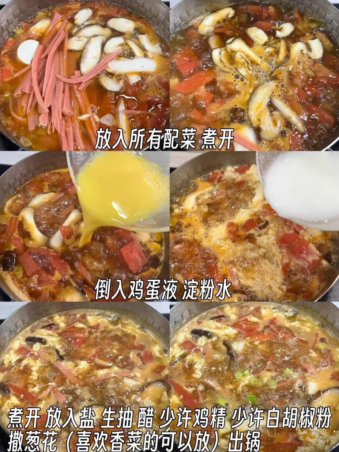 附做法: 1️⃣番茄切块、香菇切片、火腿切丝、豆腐切块,准备葱蒜末 2️⃣锅中烧油,放入葱蒜末爆香,放番茄炒出汁水,加足量水煮开 3️⃣放入所有配菜,煮开后放入蛋液、淀粉水,煮开后放盐、生抽、醋、少许鸡精、少许白胡椒粉 4️⃣煮开撒葱花(喜欢香菜的也可以放)出锅✅