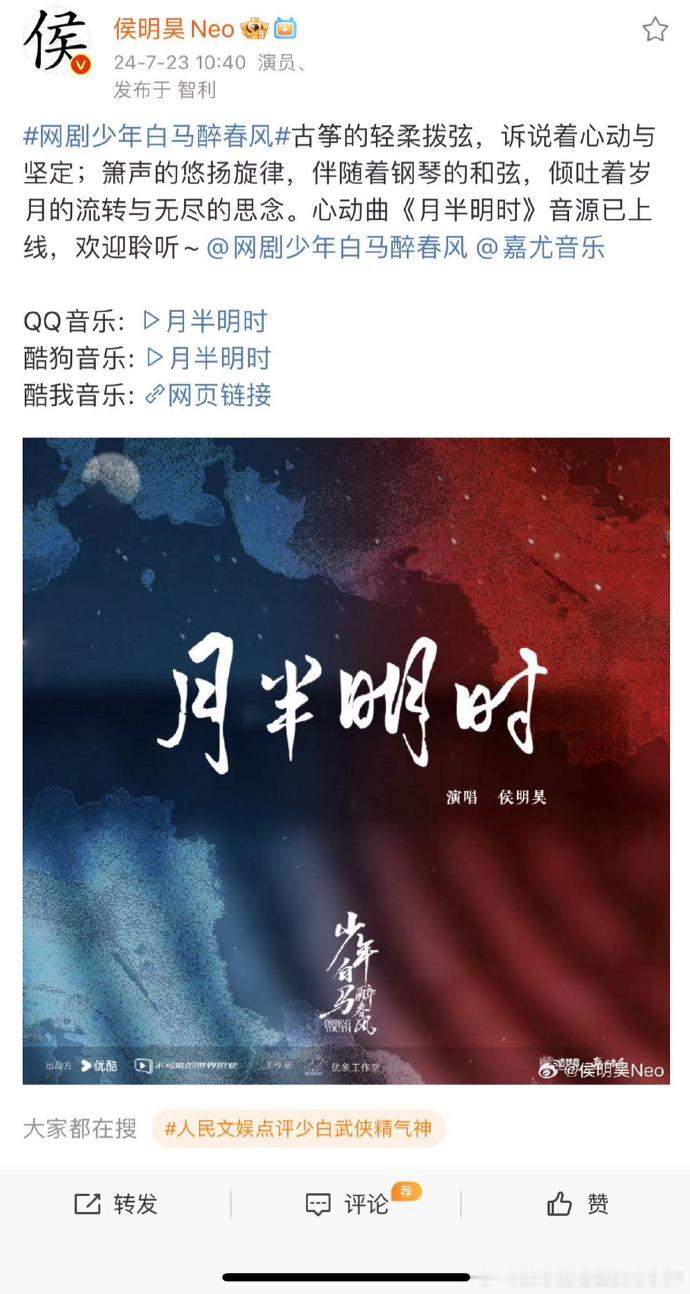 #歌手侯明昊回来了# 为《少年白马醉春风》献声的《月半明时》火热上线!歌手侯明昊