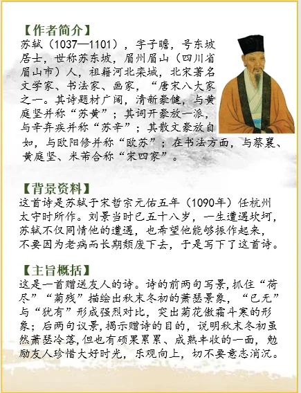 这是一首赠送友人的诗。诗的前两句写景,抓住“荷尽”“菊残”描绘出秋末冬初的萧瑟景象,“已无”与“犹有”形成强烈对比,突出菊花傲霜斗寒的形象;后两句议景,揭示赠诗的目的,说明秋末冬初虽然萧瑟冷落,但也有硕果累累、成熟丰收的一面, 勉励友人珍惜大好时光,乐观向上,切不要意志消沉。