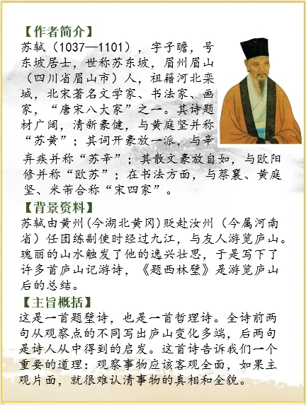 苏轼由黄州(今湖北黄冈)贬赴汝州(今属河南省)任团练副使时经过九江,与友人游览庐山。瑰丽的山水触发了他的逸兴壮思,于是写下了许多首庐山记游诗,《题西林壁》是游览庐山后的总结。