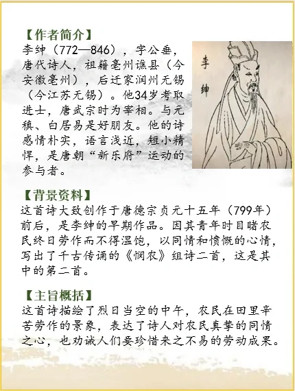 这首诗大致创作于唐德宗贞元十五年(799年)前后,是李绅的早期作品。因其青年时目睹农民终日劳作而不得温饱,以同情和愤慨的心情,写出了千古传诵的《悯农》组诗二首,这是其中的第二首。